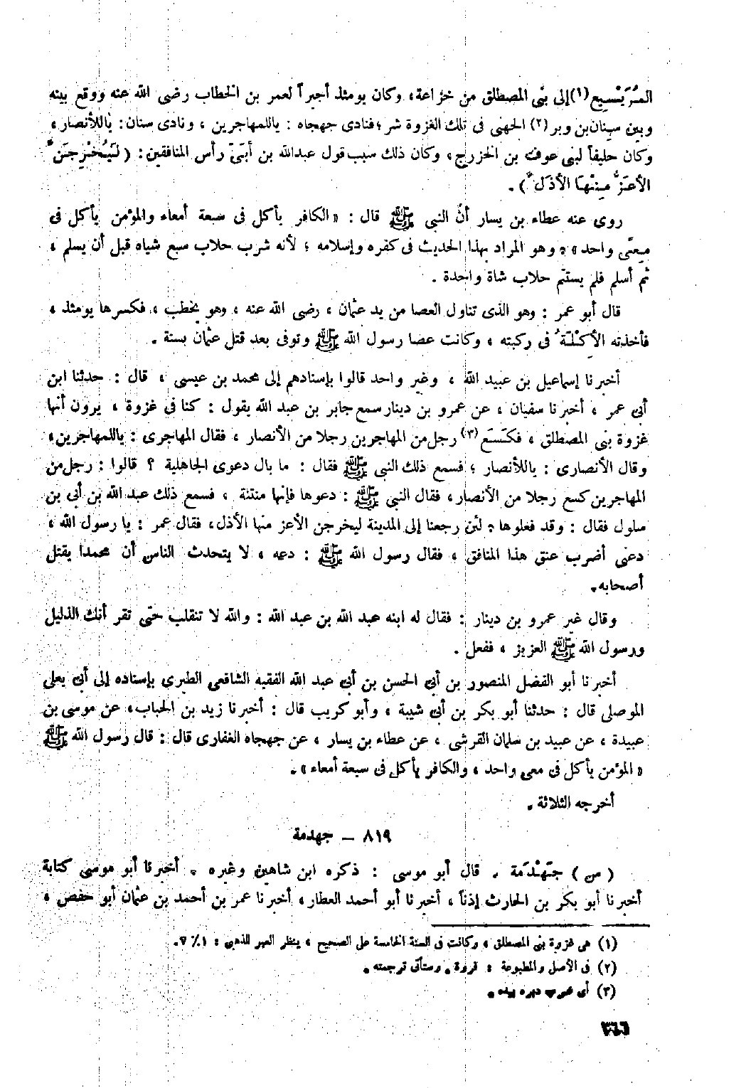 أَخْبَرَنَا أَبُو الْفَضْلِ الْمَنْصُورُ بْنُ أَبِي الْحَسَنِ بْنِ أَبِي عَبْدِ اللَّهِ الْفَقِيهُ الشَّافِعِيُّ الطَّبَرِيُّ بِإِسْنَادِهِ إِلَى أَبِي يَعْلَى الْمَوْصِلِيِّ قَالَ: حَدَّثَنَا أَبُو بَكْرِ بْنُ أَبِي شَيْبَةَ، وَأَبُو كُرَيْبٍ قَالَ: أَخْبَرَنَا زَيْدُ بْنُ الْحُبَابِ، عَنْ مُوسَى بْنِ عُبَيْدَةَ، عَنْ عُبَيْدِ بْنِ سَلْمَانَ الْقُرَشِيِّ، عَنْ عَطَاءِ بْنِ يَسَارٍ، عَنْ جَهْجَاهٌ الْغِفَارِيُّ قَالَ: قَالَ رَسُولُ اللَّهِ صَلَّى اللَّهُ عَلَيْهِ وَسَلَّمَ «الْمُؤْمِنُ يَأْكُلُ فِي مَعِيٍّ واحد، والكافر يأكل في سبعة أمعاء» . أخرجه الثلاثة.