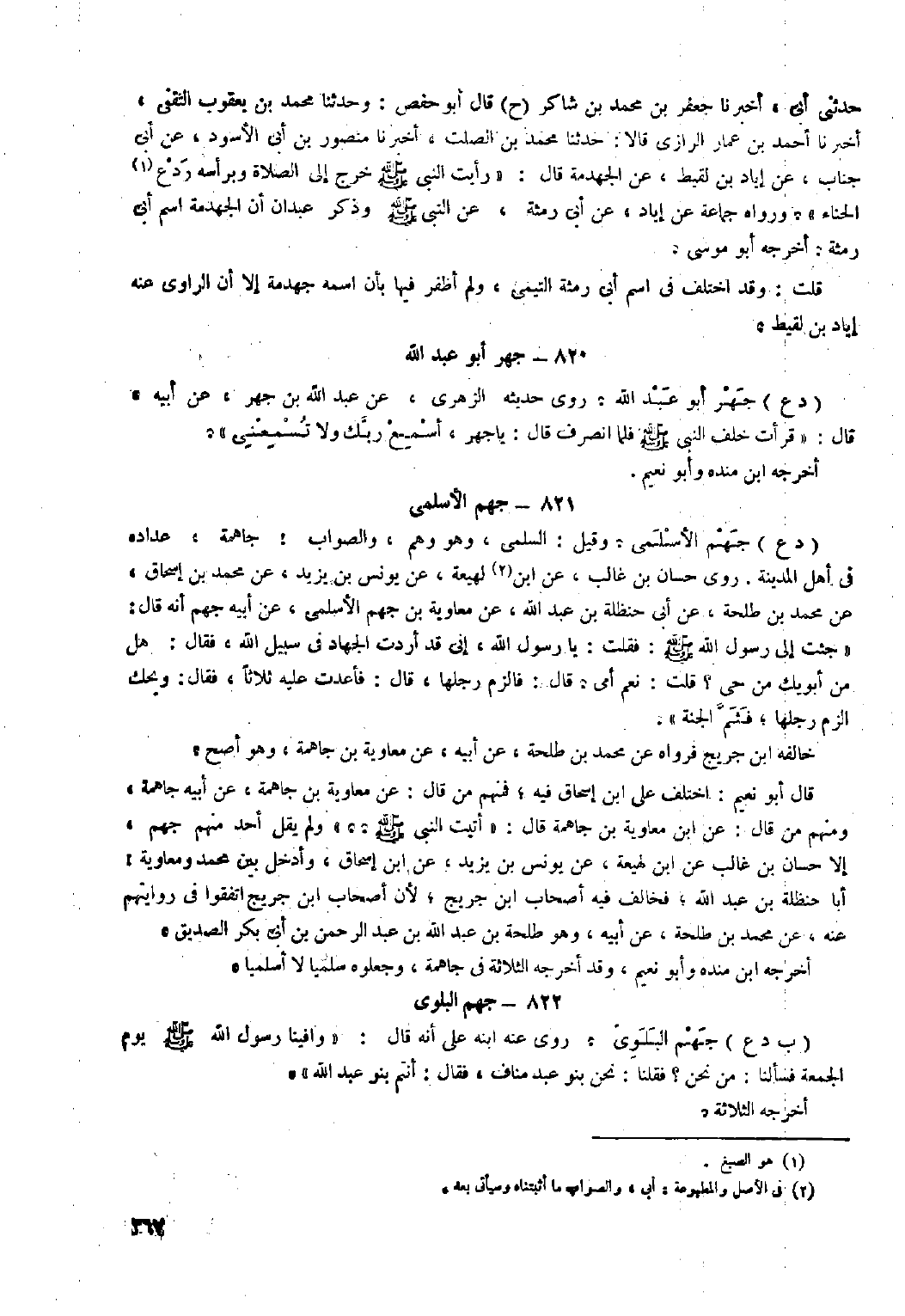 خالفه ابن جريج فرواه عَنْ مُحَمَّدِ بْنِ طَلْحَةَ، عَنْ أَبِيهِ، عَنْ معاوية بْن جاهمة، وهو أصح. قال أبو نعيم: اختلف على ابن إِسْحَاق فيه، فمنهم من قال: عَنْ معاوية بْن جاهمة، عَنْ أبيه جاهمة، ومنهم من قال: عَنِ ابن معاوية بْن جاهمة قال: «أتيت النَّبِيّ صَلَّى اللَّهُ عَلَيْهِ وَسَلَّمَ..» ولم يقل أحد منهم جهم، إلا حسان بْن غالب عَنِ ابن لهيعة، عَنْ يونس بْن يَزِيدَ، عَنِ ابن إِسْحَاق، وأدخل بين مُحَمَّد ومعاوية: