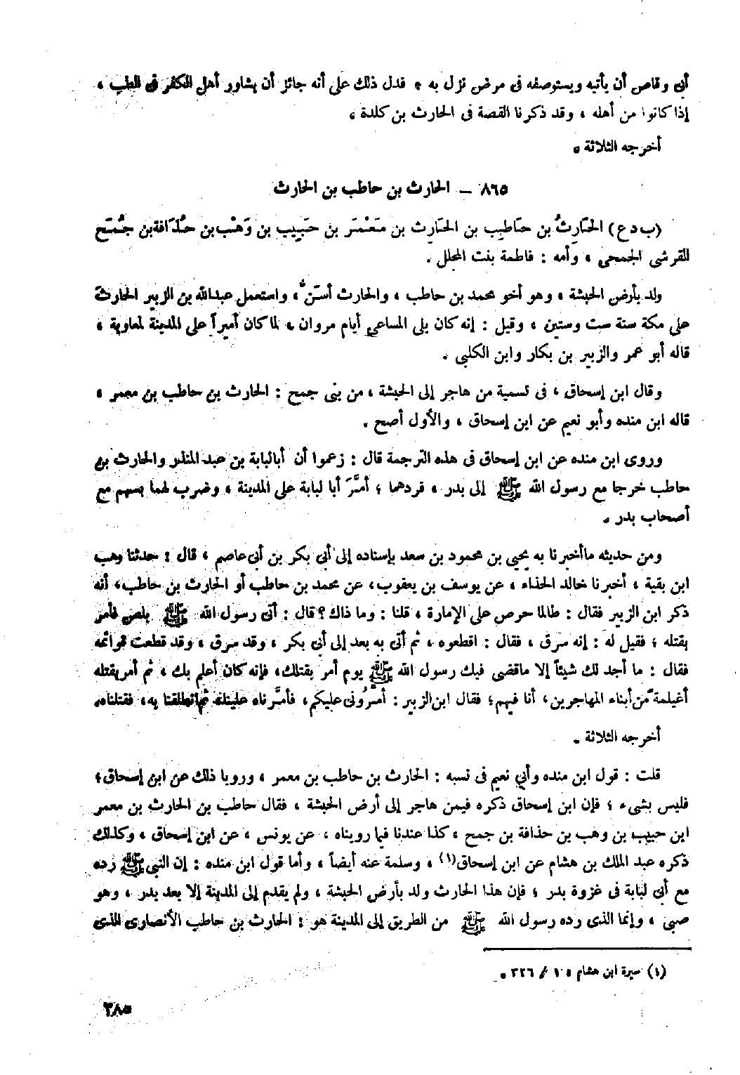 قلت: قول ابن منده وأبي نعيم في نسبه: الحارث بْن حاطب بْن معمر، ورويا ذلك عَنِ ابن إِسْحَاق، فليس بشيء، فإن ابن إِسْحَاق ذكره فيمن هاجر إِلَى أرض الحبشة، فقال حاطب بْن الحارث بن معمر ابن حبيب بْن وهب بْن حذافة بْن جمح، كذا عندنا فيما رويناه، عَنْ يونس، عَنِ ابْنِ إِسْحَاق، وكذلك ذكره عَبْد الْمَلِكِ بْن هشام عَنِ ابن إِسْحَاق [١] ، وسلمة عنه أيضًا، وأما قول ابن منده: إن النَّبِيّ صَلَّى اللَّهُ عَلَيْهِ وَسَلَّمَ رده مع أَبِي لبابة في غزوة بدر، فإن هذا الحارث ولد بأرض الحبشة، ولم يقدم إِلَى المدينة إلا بعد بدر، وهو صبي، وَإِنما الذي رده رَسُول اللَّه صَلَّى اللَّهُ عَلَيْهِ وَسَلَّمَ من الطريق إِلَى المدينة هو: الحارث بْن حاطب الأنصاري الّذي