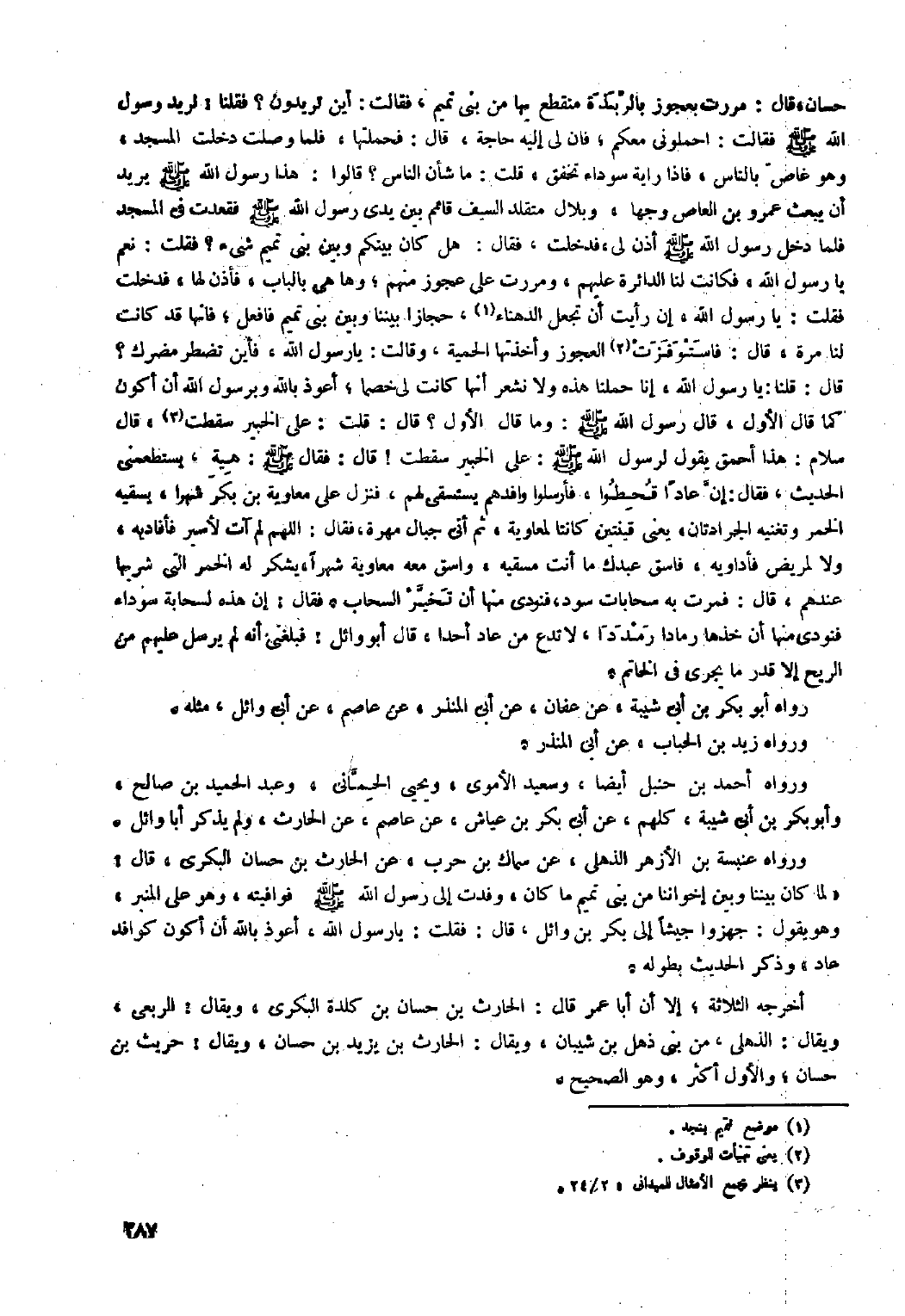 حَسَّانٍ، قَالَ: مَرَرْتُ بِعَجُوزٍ بِالرَّبَذَةِ مُنْقَطِعٌ بِهَا مِنْ بَنِي تَمِيمٍ، فَقَالَتْ: أَيْنَ تُرِيدُونَ؟ فَقُلْنَا: نريد رسول الله صلى الله عليه وسلم فَقَالَتْ: احْمِلُونِي مَعَكُمْ، فَإِنَّ لِي إِلَيْهِ حَاجَةً، قَالَ: فَحَمَلْتُهَا، فَلَمَّا وَصَلَتْ دَخَلَتِ الْمَسْجِدَ، وَهُوَ غَاصًّ بِالنَّاسِ، فَإِذَا رَايَةٌ سَوْدَاءُ تَخْفِقُ، قُلْتُ: مَا شَأْنُ النَّاسِ؟ قَالُوا: هَذَا رَسُولُ اللَّهِ صَلَّى اللَّهُ عَلَيْهِ وَسَلَّمَ يُرِيدُ أَنْ يَبْعَثَ عَمْرَو بْنَ الْعَاصِ وَجْهًا، وَبِلالٌ مُتَقَلِّدُ السَّيْفَ قَائِمٌ بَيْنَ يَدَيْ رَسُولِ اللَّهِ صَلَّى اللَّهُ عَلَيْهِ وَسَلَّمَ فَقَعَدْتُ فِي الْمَسْجِدِ فَلَمَّا دَخَلَ رَسُولُ اللَّهِ صَلَّى اللَّهُ عَلَيْهِ وسلم أذن لِي، فَدَخَلْتُ، فَقَالَ: هَلْ كَانَ بَيْنَكُمْ وَبَيْنَ بَنِي تَمِيمٍ شَيْءٌ؟ فَقُلْتُ: نَعَمْ يَا رَسُولَ اللَّهِ، فَكَانَتْ لَنَا الدَّائِرَةُ عَلَيْهِمْ، وَمَرَرْتُ عَلَى عَجُوزٍ مِنْهُمْ، وَهَا هِيَ بِالْبَابِ، فَأَذِنَ لَهَا، فَدَخَلَتْ فَقُلْتُ: يَا رَسُولَ اللَّهِ، إِنْ رَأَيْتَ أن تجعل الدهناء [١] ، حجازا بَيْنَنَا وَبْيَن بَنِي تَمِيمٍ فَافْعَلْ، فَإِنَّهَا قَدْ كَانَتْ لَنَا مَرَّةً، قَالَ: فَاسْتَوْفَزَتِ [٢] الْعَجُوزُ وَأَخَذَتْهَا الْحِمْيَةُ، وَقَالَتْ: يَا رَسُولَ اللَّهِ، فَأَيْنَ تَضْطَرُّ مُضَرَكَ؟