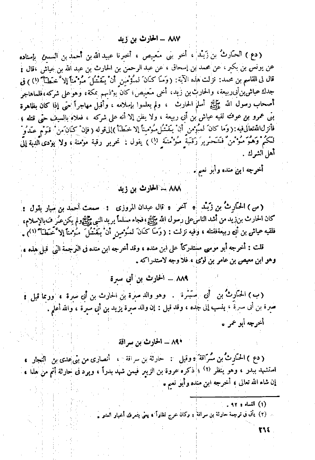 قال لي الْقَاسِم بْن مُحَمَّد: نزلت هذه الآية: وَما كانَ لِمُؤْمِنٍ أَنْ يَقْتُلَ مُؤْمِناً إِلَّا خَطَأً ٤: ٩٢ [١] في جدك عياش بْن أَبِي ربيعة، والحارث بْن زيد، أخي معيص، كان يؤذيهم بمكة، وهو عَلَى شركه، فلما هاجر أصحاب رَسُول اللَّهِ صَلَّى اللَّهُ عَلَيْهِ وَسَلَّمَ أسلم الحارث، ولم يعلموا بإسلامه، وأقبل مهاجرًا حتى إذا كان بظاهرة بني عمرو بْن عوف لقيه عياش بْن أَبِي ربيعة، ولا يظن إلا أَنَّهُ عَلَى شركه، فعلاه بالسيف حتى قتله، فأنزل اللَّه تعالى فيه: وَما كانَ لِمُؤْمِنٍ أَنْ يَقْتُلَ مُؤْمِناً إِلَّا خَطَأً ٤: ٩٢ إِلَى قوله فَإِنْ كانَ مِنْ قَوْمٍ عَدُوٍّ لَكُمْ وَهُوَ مُؤْمِنٌ فَتَحْرِيرُ رَقَبَةٍ مُؤْمِنَةٍ ٤: ٩٢ [١] يقول: تحرير رقبة مؤمنة، ولا يؤدي الدية إِلَى أهل الشرك.