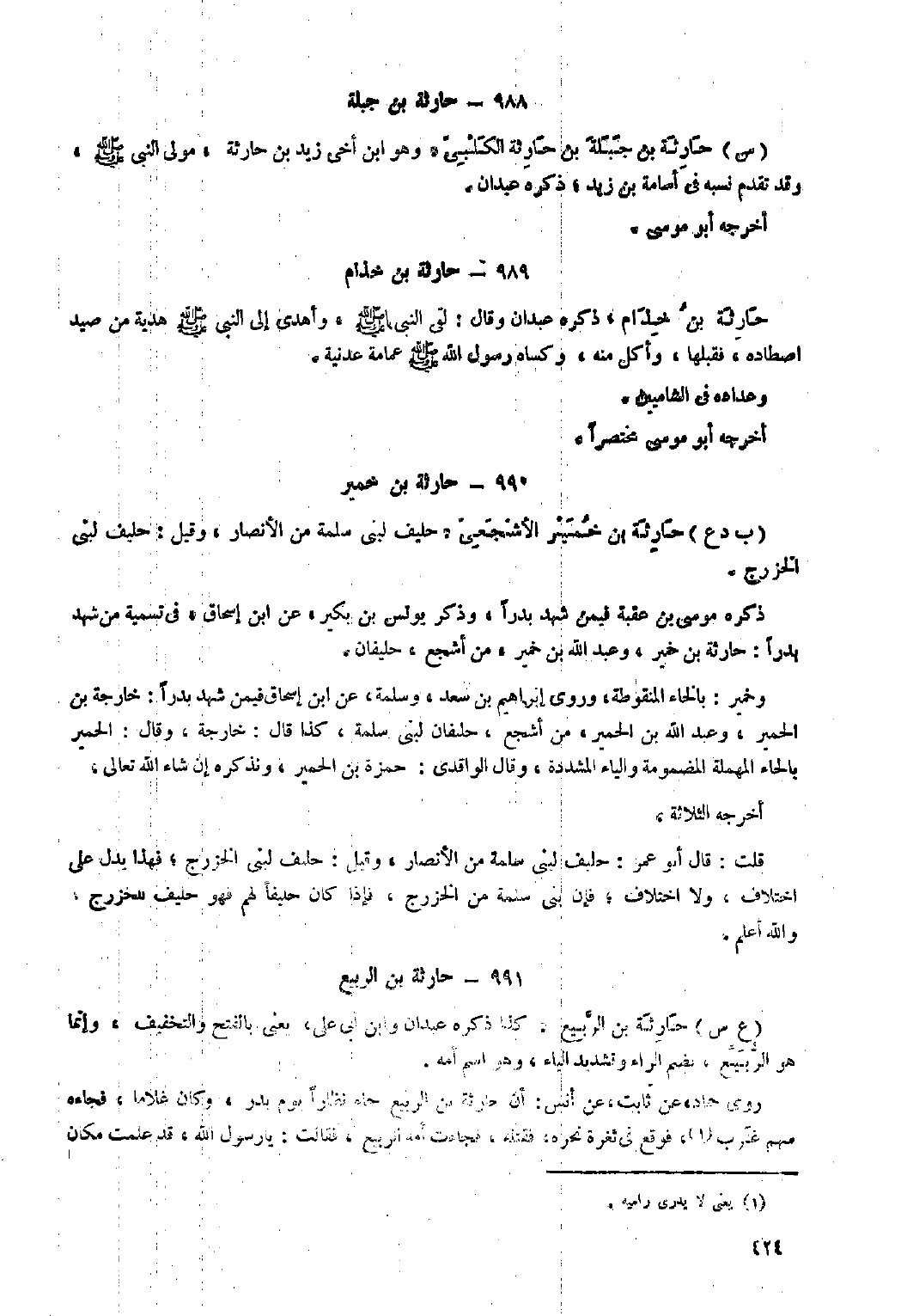 (ع س) حارثة بْن الربيع. كذا ذكره عبدان وابن أَبِي علي، يعني بالفتح والتخفيف، وَإِنما هو الربيع، بضم الراء وتشديد الياء، وهو اسم أمه.