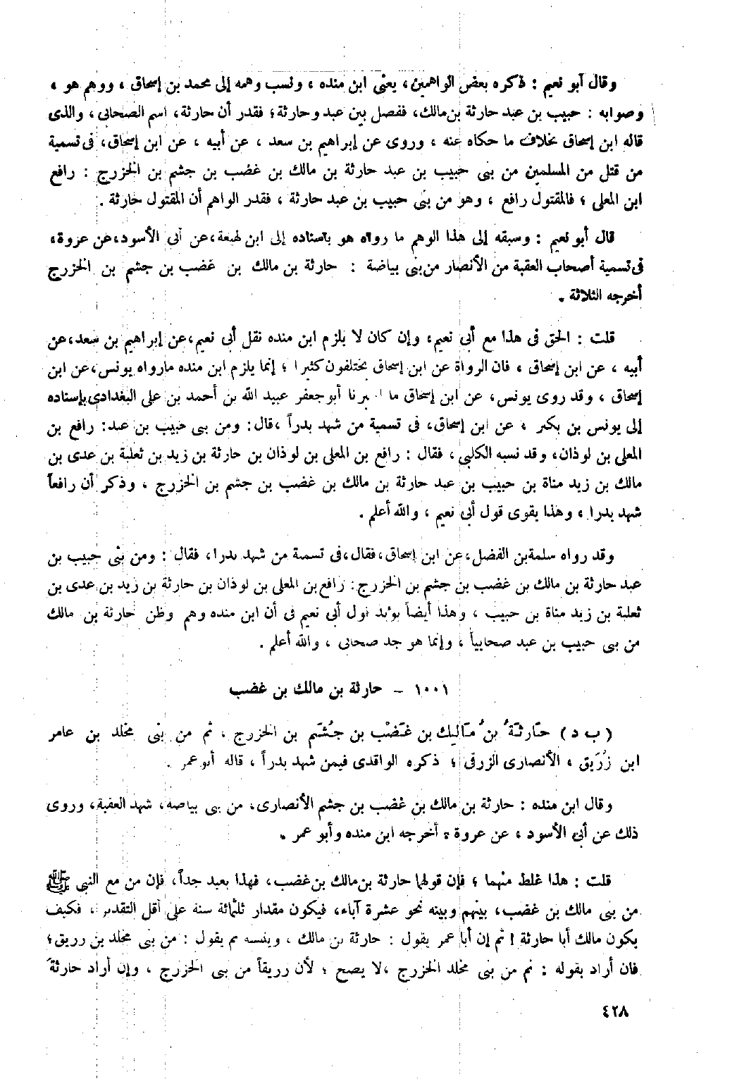 وقد رواه سلمة بْن الفضل، عَنِ ابن إِسْحَاق، فقال، في تسمية من شهد بدرًا، فقال: ومن بني حبيب بْن عَبْد حارثة بْن مَالِك بْن غضب بْن جشم بْن الخزرج: رافع بْن المعلى بْن لوذان بْن حارثة بْن زيد بْن عدي بْن ثعلبة بن زيد مناة بن حبيب، وهذا أيضًا يؤيد قول أَبِي نعيم في أن ابن منده وهم وظن حارثة بن مالك من بنى حبيب بن عبد صحابيًا، وَإِنما هو جد صحابي، والله أعلم.