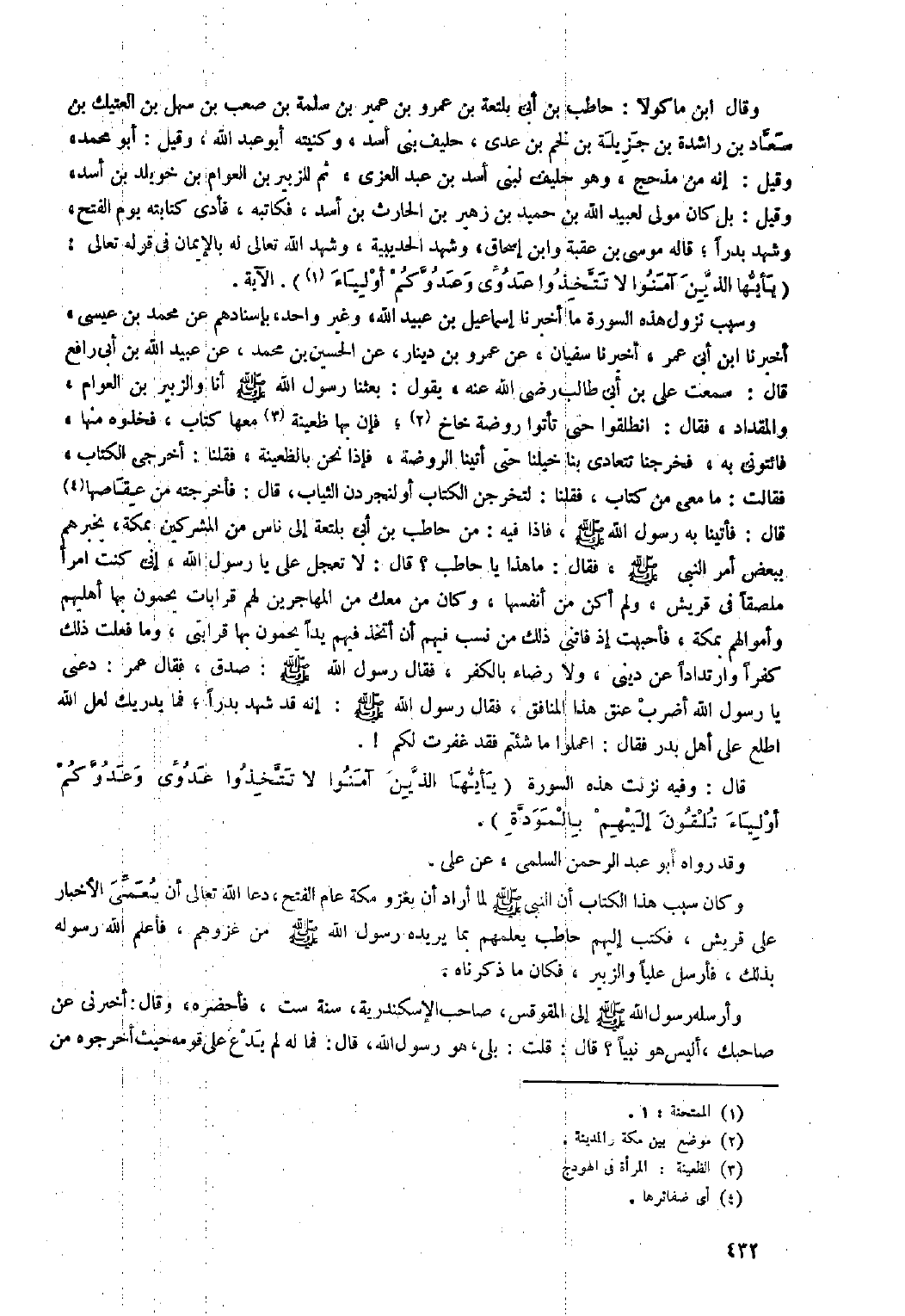 وسبب نزول هذه السورة ما أَخْبَرَنَا إِسْمَاعِيلُ بْنُ عُبَيْدِ اللَّهِ، وَغَيْرُ وَاحِدٍ، بِإِسْنَادِهِمْ عَنْ مُحَمَّدِ بْنِ عِيسَى، أَخْبَرَنَا ابْن أَبِي عُمَرَ، أَخْبَرَنَا سُفْيَانُ، عَنْ عَمْرِو بْنِ دِينَارٍ، عَنِ الْحُسَيْنِ بْنِ مُحَمَّدٍ، عَنْ عُبَيْدِ اللَّهِ بْنِ أَبِي رَافِعٍ قَالَ: سَمِعْتُ عَلِيَّ بْنَ أَبِي طَالِبٍ رَضِيَ اللَّهُ عَنْهُ، يَقُولُ: بَعَثَنَا رَسُولُ اللَّهِ صَلَّى اللَّهُ عَلَيْهِ وَسَلَّمَ أَنَا وَالزُّبَيْرُ بْنُ الْعَوَّامِ، وَالْمِقْدَادُ، فَقَالَ: انْطَلِقُوا حَتَّى تَأَتْوُا رَوْضَةَ خَاخٍ [٢] ، فَإِنَّ بِهَا ظَعِينَةً [٣] مَعَهَا كِتَابٌ، فَخُذُوهُ مِنْهَا، فَائْتُونِي بِهِ، فَخَرَجْنَا تَتَعَادَى بِنَا خَيْلُنَا حَتَّى أَتَيْنَا الرَّوْضَةَ، فَإِذَا نَحْنُ بِالظَّعِينَةِ، فَقُلْنَا: أَخْرِجِي الْكِتَابَ، فَقَالَتْ: مَا مَعِي مِنْ كِتَابٍ، فَقُلْنَا: لِتُخْرِجِنَّ الْكِتَابَ أَوْ لَنُجَرِدَنَّ الثِّيَابَ، قَالَ: فَأَخْرَجَتْهُ مِنْ عِقَاصِهَا [٤] قَالَ: فَأَتَيْنَا بِهِ رَسُول اللَّهِ صَلَّى اللَّهُ عَلَيْهِ وسلم، فإذا فِيهِ: مِنْ حَاطِبِ بْنِ أَبِي بَلْتَعَةَ إِلَى نَاسٍ مِنَ الْمُشْرِكِينَ بِمَكَّةَ، يُخْبُرُهُمْ بِبَعْضِ أَمْرِ النبي صلى الله عليه وسلم، فقال: ما هَذَا يَا حَاطِبُ؟ قَالَ: لا تَعْجَلْ عَلَيَّ يَا رَسُولَ اللَّهِ، إِنِّي كُنْتُ امْرَأً مُلْصَقًا فِي قُرَيْشٍ، وَلَمْ أَكُنْ مِنْ أَنْفُسِهَا، وَكَانَ مَنْ مَعَكَ مِنَ الْمُهَاجِرِينَ لَهُمْ قَرَابَاتٌ يَحْمُونَ بِهَا أَهْلِيهُمْ وَأَمْوَالَهُمْ بِمَكَّةَ، فَأَحْبَبْتُ إِذْ فَاتَنِي ذَلِكَ مِنْ نَسَبٍ فِيهِمْ أَنْ أَتَّخِذَ فِيهِمْ يَدًا يَحْمُونَ بِهَا قَرَابَتِي، وَمَا فَعَلْتُ ذَلِكَ كُفْرًا وَارْتِدَادًا عَنْ دِينِي، وَلا رِضَاءً بِالْكُفْرِ، فقال رسول الله صلى الله عليه وسلم: صَدَقَ، فَقَالَ عُمَرُ: دَعْنِي يَا رَسُولَ اللَّهِ أَضْرِبُ عُنَقَ هَذَا الْمُنَافِقِ، فَقَالَ رَسُولُ اللَّهِ صلى الله عليه وسلم: إنه قد شهد بدرا، فما يدريك لعل الله اطَّلَعَ عَلَى أَهْلِ بَدْرٍ فَقَالَ: اعْمَلُوا مَا شِئْتُمْ فَقَدْ غَفَرْتُ لَكُمْ!.