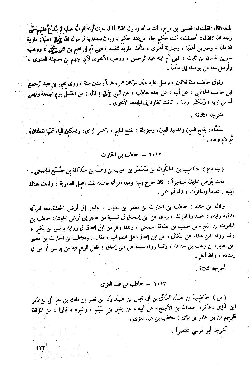 وقال ابن منده: حاطب بْن الحارث بْن معمر بْن حبيب، هاجر إِلَى أرض الحبشة معه امرأته فاطمة وابناه: مُحَمَّد والحارث، روى عَنِ ابْنِ إِسْحَاق فِي تسمية من هاجر إِلَى أرض الحبشة: حاطب بْن الحارث بْن المغيرة بْن حبيب بْن حذافة الجمحي، وهذا وهم من ابن إِسْحَاق في رواية يونس بْن بكير، وقد رَوَاهُ ابْنُ هشام عَنِ البكائي، عَنِ ابْنِ إِسْحَاق، عَلَى الصواب، فقال: وحاطب بْن الحارث بْن معمر ابن حبيب بن وهب بن حذافة، وكذا رواه سلمة عَنِ ابن إِسْحَاق، فلعل الوهم فيه من يونس أو من في إسناده، والله أعلم.