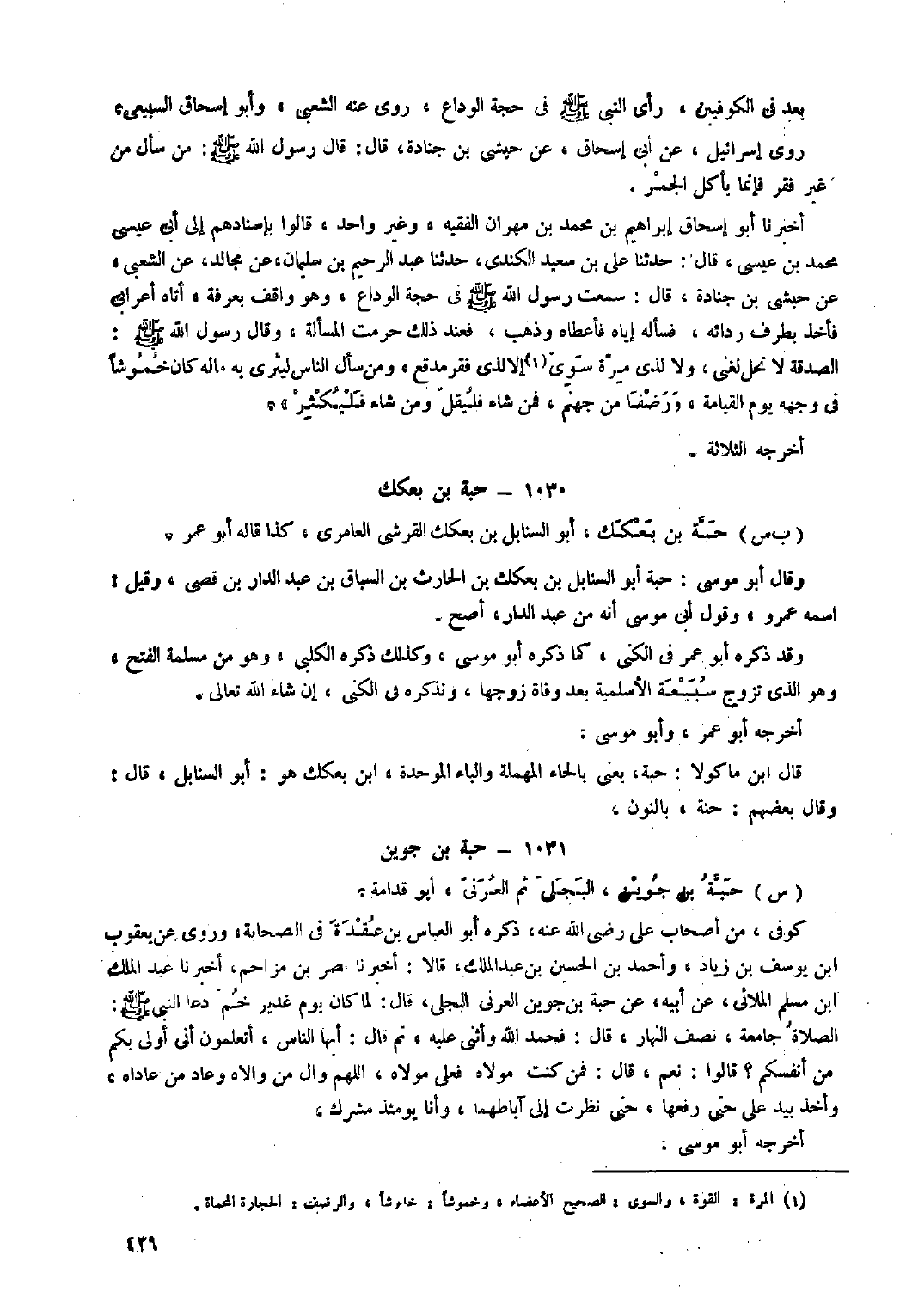 روى إسرائيل، عَنْ أَبِي إِسْحَاق، عَنْ حبشي بْن جنادة، قال: قال رسول الله صلى الله عليه وسلم: من سأل من غير فقر فإنما يأكل الجمر. أخبرنا أبو إسحاق إبراهيم بن محمد بن مِهْرَانَ الْفَقِيهُ، وَغَيْرُ وَاحِدٍ، قَالُوا بِإِسْنَادِهِمْ إِلَى أَبِي عِيسَى مُحَمَّدِ بْنِ عِيسَى، قَالَ: حَدَّثَنَا عَلِيُّ بْنُ سَعِيدٍ الْكِنْدِيُّ، حَدَّثَنَا عَبْدُ الرَّحِيمِ بْنُ سُلَيْمَانَ، عَنْ مُجَالِدٍ، عَنِ الشَّعْبِيِّ، عَنْ حَبَشِيِّ بْنِ جُنَادَةَ، قَالَ: سَمِعْتُ رَسُولَ اللَّهِ صلى الله عليه وسلم في حجة الوداع، وَهُوَ وَاقِفٌ بِعَرَفَةَ، أَتَاهُ أَعْرَابِيٌّ فَأَخَذَ بِطَرْفِ رِدَائِهِ، فَسَأَلَهُ إِيَّاهُ فَأَعْطَاهُ وَذَهَبَ، فَعِنْدَ ذَلِكَ حُرِّمَتِ الْمَسْأَلَةُ، وَقَالَ رَسُولُ اللَّهِ صَلَّى اللَّهُ عَلَيْهِ وَسَلَّمَ:
