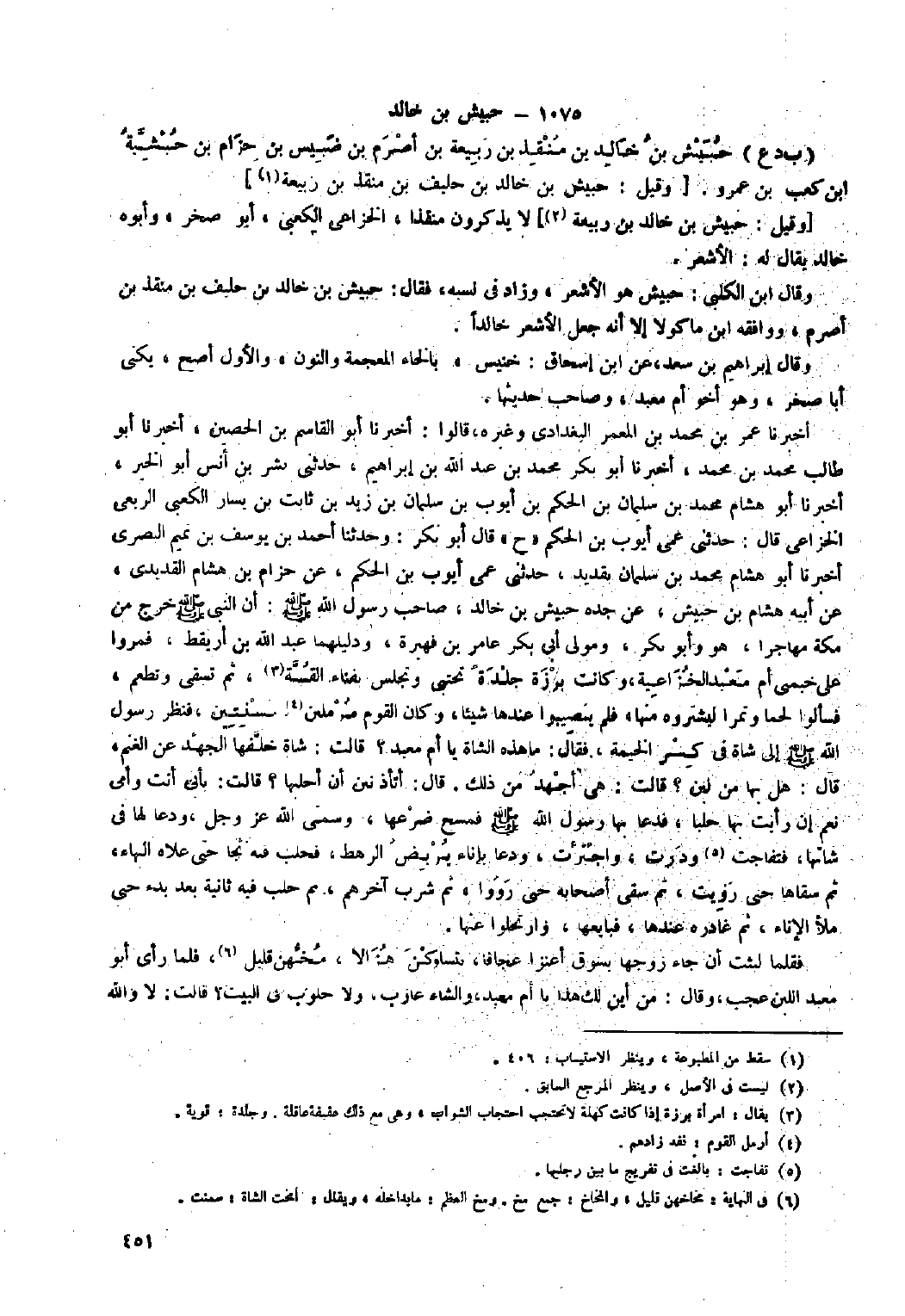 أَخْبَرَنَا عُمَرُ بْنُ مُحَمَّدِ بْنِ الْمُعَمَّرِ الْبَغْدَادِيُّ وَغَيْرُهُ، قَالُوا: أَخْبَرَنَا أَبُو الْقَاسِمِ بْنُ الْحُصَيْنِ، أَخْبَرَنَا أَبُو طَالِبٍ مُحَمَّدُ بْنُ مُحَمَّدٍ، أَخْبَرَنَا أَبُو بَكْرٍ مُحَمَّدُ بْنُ عَبْدِ اللَّهِ بْنِ إِبْرَاهِيمَ، حَدَّثَنِي بِشْرُ بْنُ أَنَسٍ أَبُو الْخَيْرِ، أَخْبَرَنَا أَبُو هِشَامٍ مُحَمَّدُ بْنُ سُلَيْمَانَ بْنِ الْحَكَمِ بْنِ أَيُّوبَ بْنِ سُلَيْمَانَ بْنِ زَيْدِ بْنِ ثَابِتِ بْنِ يَسَارٍ الْكَعْبِيُّ الرَّبَعِيُّ الْخُزَاعِيُّ قَالَ: حَدَّثَنِي عَمِّي أَيُّوبُ بْنُ الْحَكَمِ «ح» قَالَ أَبُو بَكْرٍ: وَحَدَّثَنَا أَحْمَدُ بْنُ يُوسُفَ بْنِ تَمِيمٍ الْبَصْرِيُّ أَخْبَرَنَا أبو هشام محمد بن سليمان بِقُدَيْدَ، حَدَّثَنِي عَمِّي أَيُّوبُ بْنُ الْحَكَمِ، عَنْ حِزَامِ بْنِ هِشَامٍ الْقُدَيْدِيِّ، عَنْ أَبِيهِ هِشَامِ بْنِ حُبَيْشٍ، عَنْ جَدِّهِ حُبَيْشِ بْنِ خَالِدٍ، صاحب رسول الله صلى الله عليه وسلم: إن النَّبِيّ صَلَّى اللَّهُ عَلَيْهِ وَسَلَّمَ خرج مِنْ مَكَّةَ مُهَاجِرًا، هُوَ وَأَبُو بَكْرٍ، وَمَوْلَى أَبِي بَكْرٍ عَامِرِ بْنِ فُهَيْرَةَ، وَدَلِيلُهُمَا عَبْدُ اللَّهِ بْنُ أُرَيْقِط، فَمَرُّوا عَلَى خَيْمَتَيْ أُمِّ مَعْبَدٍ الْخُزَاعِيَّةِ، وَكَانَتْ بَرْزَةً جَلْدَةً تَحْتَبِي وَتَجْلِسُ بِفِنَاءِ الْقُبَّةِ [٣] ، ثُمَّ تَسْقِي وَتُطْعِمُ، فَسَأَلُوا لَحْمًا وَتَمْرًا لِيَشْتَرُوهُ مِنْهَا، فَلَمْ يُصِيبُوا عِنْدَهَا شَيْئًا، وَكَانَ الْقَوْمُ مُرْمِلِينَ [٤] مُسْنِتِينَ، فَنَظَرَ رَسُولُ اللَّهِ صَلَّى اللَّهُ عَلَيْهِ وَسَلَّمَ إِلَى شَاةٍ فِي كسر الخيمة، فَقَالَ: مَا هَذِهِ الشَّاةُ يَا أُمَّ مَعْبَدٍ؟ قَالَتْ: شَاةٌ خَلَّفَهَا الْجَهْدُ عَنِ الْغَنَمِ، قَالَ: هَلْ بِهَا مِنْ لَبَنٍ؟ قَالَتْ: هِيَ أَجْهَدُ مِنْ ذَلِكَ. قَالَ: أَتَأْذَنِينَ أَنْ أَحْلِبَهَا؟ قَالَتْ: بِأَبِي أَنْتَ وَأُمِّي نَعَمْ إِنْ رَأَيْتَ بِهَا حَلْبًا، فَدَعَا بِهَا رَسُولُ اللَّهِ صَلَّى اللَّهُ عَلَيْهِ وَسَلَّمَ فَمَسَحَ ضِرْعَهَا، وَسَمَّى اللَّهَ عَزَّ وَجَلَّ، وَدَعَا لَهَا فِي شَاتِهَا، فَتَفَاجَتْ [٥] وَدَرَّتْ، وَاجْتَرَّتْ، وَدَعَا بِإِنَاءٍ يُرْبِضُ الرَّهْطَ، فَحَلَبَ فِيهِ ثَجَا حَتَّى عَلاهُ الْبَهَاءُ، ثُمَّ سَقَاهَا حَتَّى رُوِيَتْ، ثُمَّ سَقَى أَصْحَابَهُ حَتَّى رَوَوْا، ثُمَّ شَرِبَ آخِرَهُمْ، ثُمَّ حَلَبَ فِيهِ ثَانِيَةً بَعْدَ بَدْءٍ حَتَّى مَلأَ الإِنَاءَ، ثُمَّ غادره عِنْدَهَا، فَبَايَعَهَا، وَارْتَحَلُوا عَنْهَا. فَقَلَّمَا لَبِثَتْ أَنْ جَاءَ زَوْجُهَا يَسُوقُ أَعْنُزًا عِجَافًا، يَتَسَاوَكْنَ هُزَالا، مُخُّهُنَّ قَلِيلٌ [٦] ، فَلَمَّا رَأَى أَبُو مَعْبَدٍ اللَّبَنَ عَجِبَ، وَقَالَ: مِنْ أَيْنَ لَكِ هَذَا يَا أُمَّ مَعْبَدٍ، وَالشَّاءُ عَازِبٌ، وَلا حَلُوبَ فِي البيت؟ قالت: لا والله