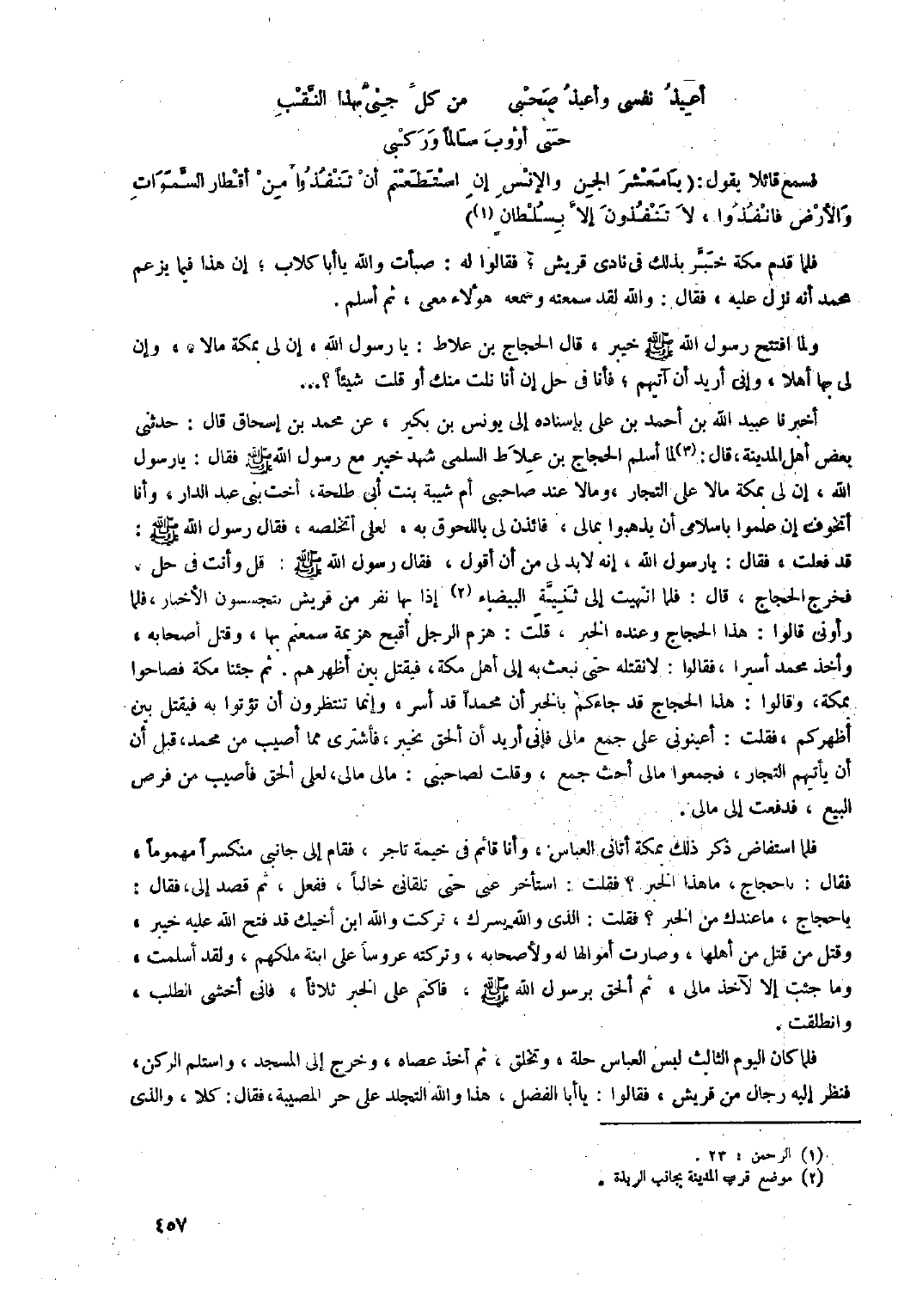 فسمع قائلا يقول: يَا مَعْشَرَ الْجِنِّ وَالْإِنْسِ إِنِ اسْتَطَعْتُمْ أَنْ تَنْفُذُوا مِنْ أَقْطارِ السَّماواتِ وَالْأَرْضِ فَانْفُذُوا، لا تَنْفُذُونَ إِلَّا بِسُلْطانٍ ٥٥: ٣٣ [١] فلما قدم مكة خبر بذلك في نادي قريش، فقالوا له: صبأت والله يا أبا كلاب، إن هذا فيما يزعم مُحَمَّد أَنَّهُ نزل عليه، فقال: والله لقد سمعته وسمعه هؤلاء معي، ثم أسلم.