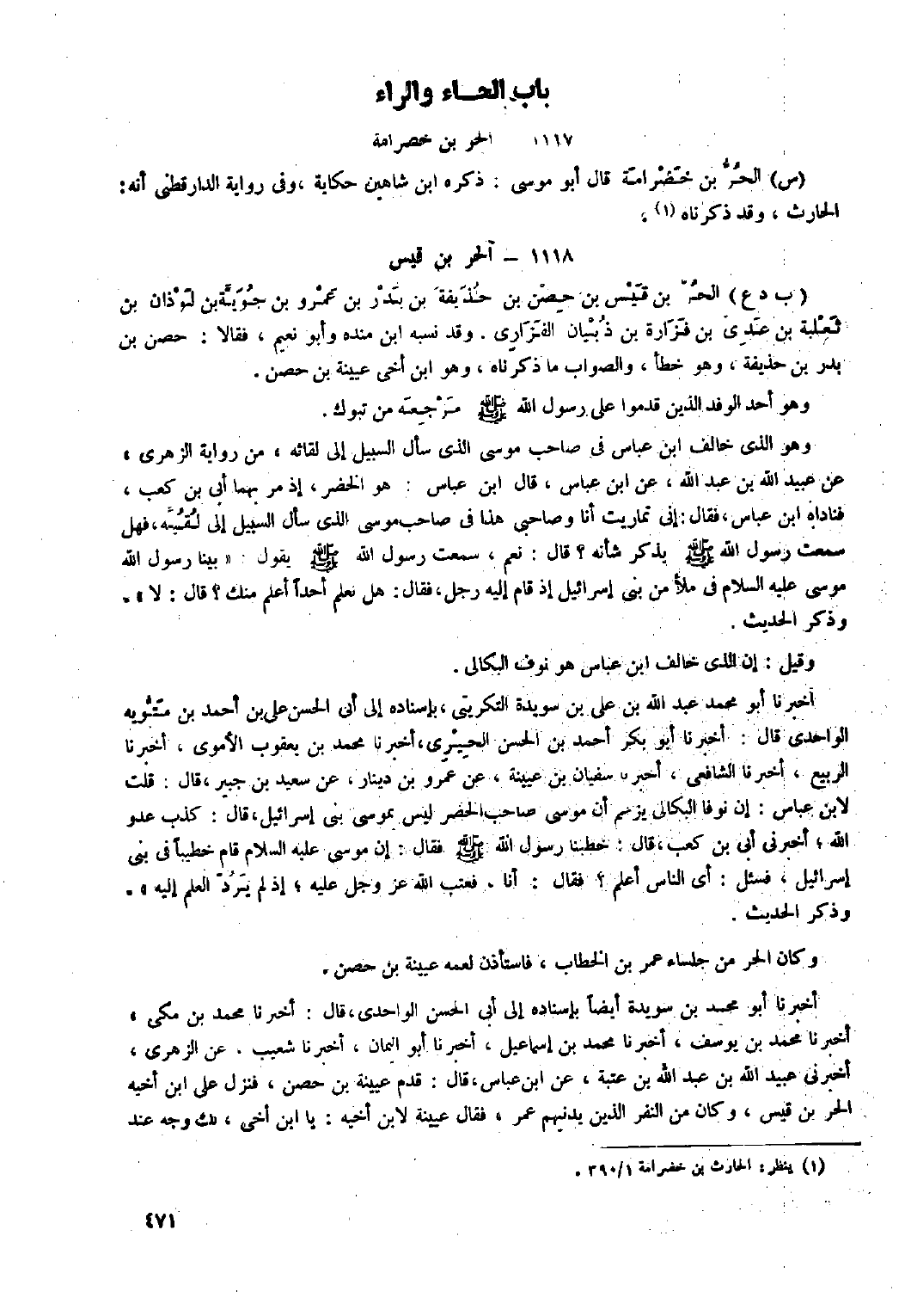 وَكَانَ الْحُرُّ مِنْ جُلَسَاءِ عُمَرَ بْنِ الْخَطَّابِ، فَاسَتْأَذَنَ لِعَمِّهِ عُيَيْنَةَ بْنِ حِصْنٍ.