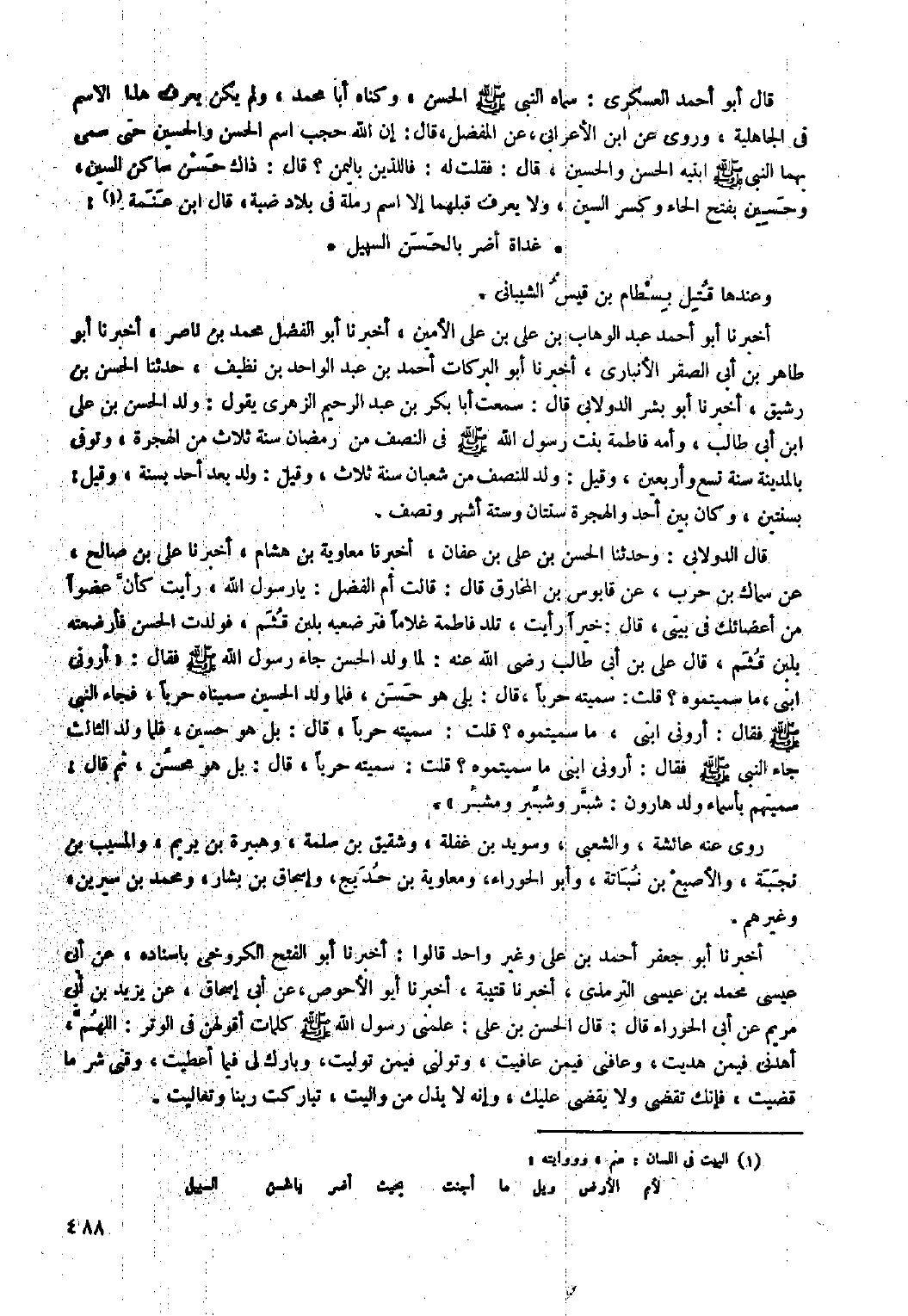 قال أَبُو أحمد العسكري: سماه النَّبِيّ صَلَّى اللَّهُ عَلَيْهِ وَسَلَّمَ الحسن، وكناه أبا مُحَمَّد، ولم يكن يعرف هذا الاسم في الجاهلية، وروى عَنِ ابن الأعرابي، عَنِ المفضل، قال: إن اللَّه حجب اسم الحسن والحسين حتى سمى بهما النَّبِيّ صَلَّى اللَّهُ عَلَيْهِ وَسَلَّمَ ابنيه الحسن والحسين، قال: فقلت له: فاللذين باليمن؟ قال: ذاك حسن ساكن السين، وحسين بفتح الحاء وكسر السين، ولا يعرف قبلهما إلا اسم رملة في بلاد ضبة، قال ابن عنمة [١] :