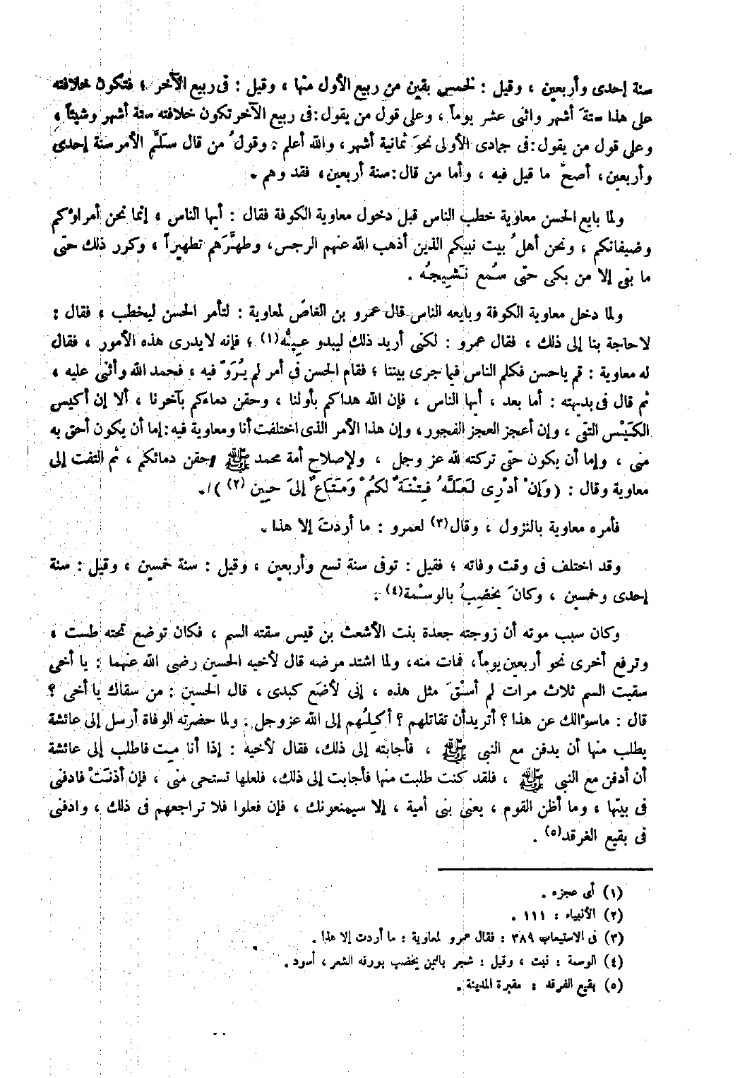لا حاجة بنا إِلَى ذلك، فقال عمرو: لكني أريد ذلك ليبدو عيه [١] ، فإنه لا يدري هذه الأمور، فقال له معاوية: قم يا حسن فكلم الناس فيما جرى بيننا، فقام الحسن في أمر لم يرو فيه، فحمد اللَّه وأثنى عليه، ثم قال في بديهته: أما بعد، أيها الناس، فإن اللَّه هداكم بأولنا، وحقن دماءكم بآخرنا، ألا إن أكيس الكيس التقي، وَإِن أعجز العجز الفجور، وَإِن هذا الأمر الذي اختلفت أنا ومعاوية فيه: إما أن يكون أحق به مني، وَإِما أن يكون حقي تركته للَّه عز وجل، ولإصلاح أمة مُحَمَّد صَلَّى اللَّهُ عليه وسلم وحقن دمائكم، ثم التفت إِلَى معاوية وقال: وَإِنْ أَدْرِي لَعَلَّهُ فِتْنَةٌ لَكُمْ وَمَتاعٌ إِلى حِينٍ ٢١: ١١١ [٢] .