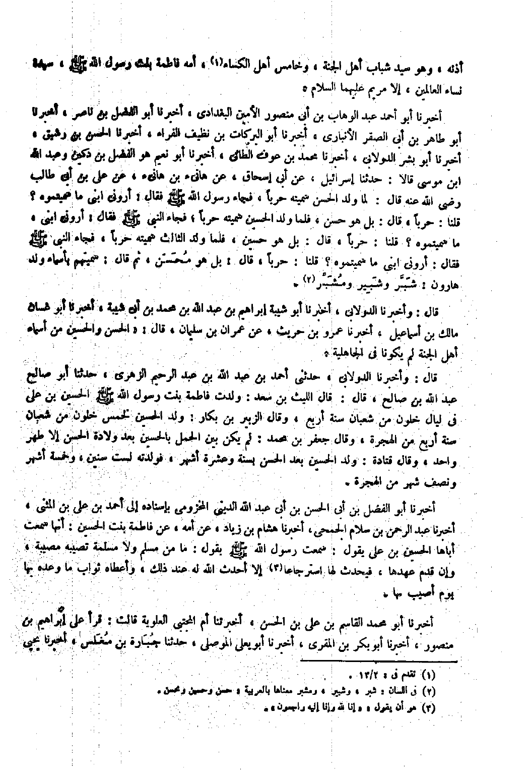 قُلْنَا: حَرْبًا، قَالَ: بَلْ هُوَ حَسَنٌ، فَلَمَّا وُلِدَ الْحُسَيْنُ سَمَّيْتُهُ حَرْبًا، فَجَاءَ النَّبِيُّ صَلَّى اللَّهُ عَلَيْهِ وَسَلَّمَ فَقَالَ: أَرُونِي ابْنِي، مَا سَمَّيْتُمُوهُ؟ قُلْنَا: حَرْبًا، قَالَ: بَلْ هُوَ حُسَيْنٌ، فَلَمَّا وُلِدَ الثَّالِثُ سَمَّيْتُهُ حَرْبًا، فَجَاءَ النَّبِيُّ صَلَّى اللَّهُ عَلَيْهِ وَسَلَّمَ فَقَالَ: أَرُونِي ابْنِي مَا سَمَّيْتُمُوهُ؟ قُلْنَا: حَرْبًا، قَالَ: بَلْ هُوَ مُحَسِّنٌ، ثُمَّ قَالَ: سَمَّيْتُهُمْ بأسماء ولد هارون: شَبَّرٍ وَشَبِيرٍ وَمُشَبِّرٍ [٢] . قال: وأَخْبَرَنَا الدولابي، أَخْبَرَنَا أَبُو شيبة إِبْرَاهِيم بْن عَبْد اللَّهِ بْن مُحَمَّدِ بْنِ أَبِي شيبة، أَخْبَرَنَا أَبُو غسان مالك بْن إِسْمَاعِيل، أَخْبَرَنَا عمرو بْن حريث، عَنْ عمران بْن سليمان، قال: «الحسن والحسين من أسماء أهل الجنة لم يكونا في الجاهلية.