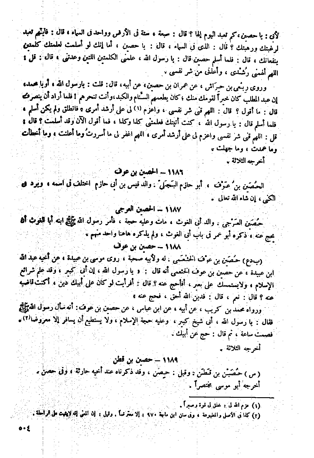 لأَبِي: يَا حُصَيْنُ، كَمْ تَعْبُدُ الْيَوْمَ إِلَهًا؟ قَالَ: سَبْعَةٌ، سِتَّةٌ فِي الأَرْضِ وَوَاحِدٌ فِي السَّمَاءِ، قَالَ: فَأَيُّهُمْ تَعْبُدُ لِرَغْبَتِكَ وَرَهْبَتِكَ؟ قَالَ: الَّذِي فِي السَّمَاءِ، قَالَ: يَا حُصَيْنُ، أَمَا إِنَّكَ لَوْ أَسْلَمْتَ لَعَلَّمْتُكَ كَلِمَتَيْنِ يَنْفَعَانَكَ، قَالَ: فَلَمَّا أَسْلَمَ حُصَيْنٌ قَالَ: يَا رَسُولَ اللَّهِ، علمني الكلمتين اللتين وعدتني، قال: قل: