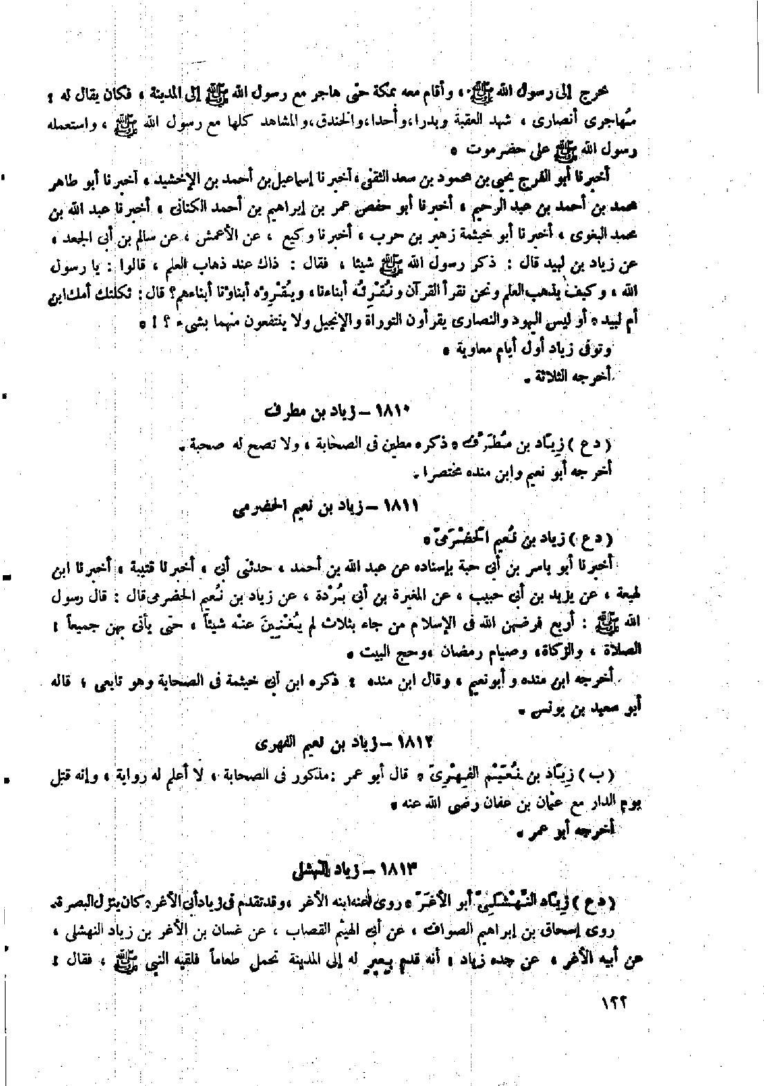 أَخْبَرَنَا أَبُو الْفَرَجِ يَحْيَى بْنُ مَحْمُودِ بْنِ سَعْدٍ الثَّقَفِيُّ، أَخْبَرَنَا إِسْمَاعِيل بْنُ أَحْمَدَ بْنِ الإِخْشِيدِ، أَخْبَرَنَا أَبُو طَاهِرٍ مُحَمَّدُ بْنُ أَحْمَدَ بن عبد الرحيم، أخبرنا أبو حفص عمر بن إبراهيم بن أحمد الكناني، أخبرنا عبد الله بن مُحَمَّد البغوي، أخبرنا أَبُو خَيْثَمَةَ زُهَيْرُ بْنُ حَرْبٍ، أَخْبَرَنَا وَكِيعٌ، عَنِ الأَعْمَشِ، عَنْ سَالِمِ بْنِ أَبِي الْجَعْدِ، عَنْ زِيَادِ بْنِ لَبِيدٍ قَالَ: ذَكَر رَسُول اللَّهِ صَلَّى اللَّهُ عَلَيْهِ وَسَلَّمَ شَيْئًا، فَقَالَ: ذَاكَ عِنْدَ ذِهَابِ الْعِلْمِ، قَالُوا: يا رَسُول اللَّهِ، وَكَيْفَ يَذْهَبُ الْعِلْمُ وَنَحْنَ نَقْرَأُ الْقُرْآنَ وَنُقْرِئُهُ أَبْنَاءَنَا، وَيُقْرِؤُهُ أَبْنَاؤُنَا أَبْنَاءَهُمْ؟ قَالَ: ثَكَلَتْكَ أمك ابن أم لبيد. أو ليس اليهود والنصارى يقرءون التوراة والإنجيل ولا ينتفعون منهما بِشَيْءٍ؟!. وتوفي زياد أول أيام معاوية.