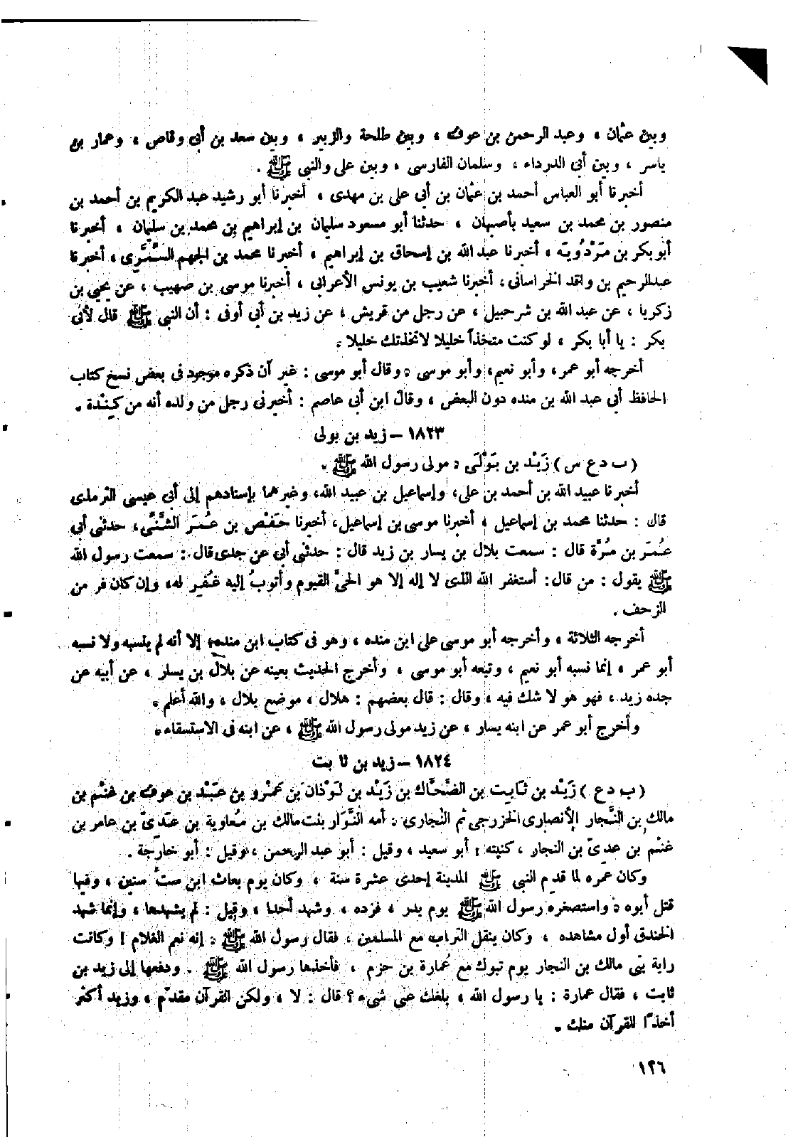 أَخْبَرَنَا أَبُو الْعَبَّاسِ أَحْمَدُ بْنُ عُثْمَانَ بْنِ أَبِي عَلِيِّ بْنِ مَهْدِيٍّ، أَخْبَرَنَا أَبُو رُشَيْدٍ عَبْدُ الْكَرِيمِ بْنُ أَحْمَدَ بْنِ مَنْصُورِ بْنِ مُحَمَّدِ بْنِ سَعِيدٍ بِأَصْبَهَانَ، حَدَّثَنَا أَبُو مَسْعُودٍ سُلَيْمَانُ بْنُ إِبْرَاهِيمَ بْنِ مُحَمَّدِ بْنِ سُلَيْمَانَ، أَخْبَرَنَا أَبُو بَكْرِ بْنُ مَرْدُوَيْهِ، أَخْبَرَنَا عَبْدُ اللَّهِ بْنُ إِسْحَاقَ بْنِ إِبْرَاهِيمَ، أَخْبَرَنَا مُحَمَّدُ بْنُ الْجَهْمِ السِّمَّرِيُّ، أَخْبَرَنَا عَبْدُ الرَّحِيمِ بْنُ وَاقِدٍ الْخُرَاسَانِيُّ، أَخْبَرَنَا شُعَيْبُ بْنُ يُونُسَ الأَعْرَابِيُّ، أَخْبَرَنَا مُوسَى بْنُ صُهَيْبٍ، عَنْ يحيى بْنِ زَكَرِيَّا، عَنْ عَبْدِ اللَّهِ بْنِ شُرَحْبِيلَ، عَنْ رَجُلٍ مِنْ قُرَيْشٍ، عَنْ زَيْدِ بْنِ أَبِي أَوْفَى: أَنَّ النَّبِيَّ صَلَّى اللَّهُ عَلَيْهِ وَسَلَّمَ قَالَ لأَبِي بَكْرٍ: يَا أَبَا بَكْرٍ، لَوْ كُنْتُ مُتَّخِذًا خَلِيلًا لاتَّخَذْتُكَ خَلِيلًا. أَخْرَجَهُ أبو عمر، وأبو نعيم، وأبو موسى. وقال أَبُو موسى: غير أن ذكره موجود في بعض نسخ كتاب الحافظ أَبِي عَبْد اللَّهِ بْن منده دون البعض، وقال ابن أَبِي عاصم: أخبرني رجل من ولده أَنَّهُ من كندة.