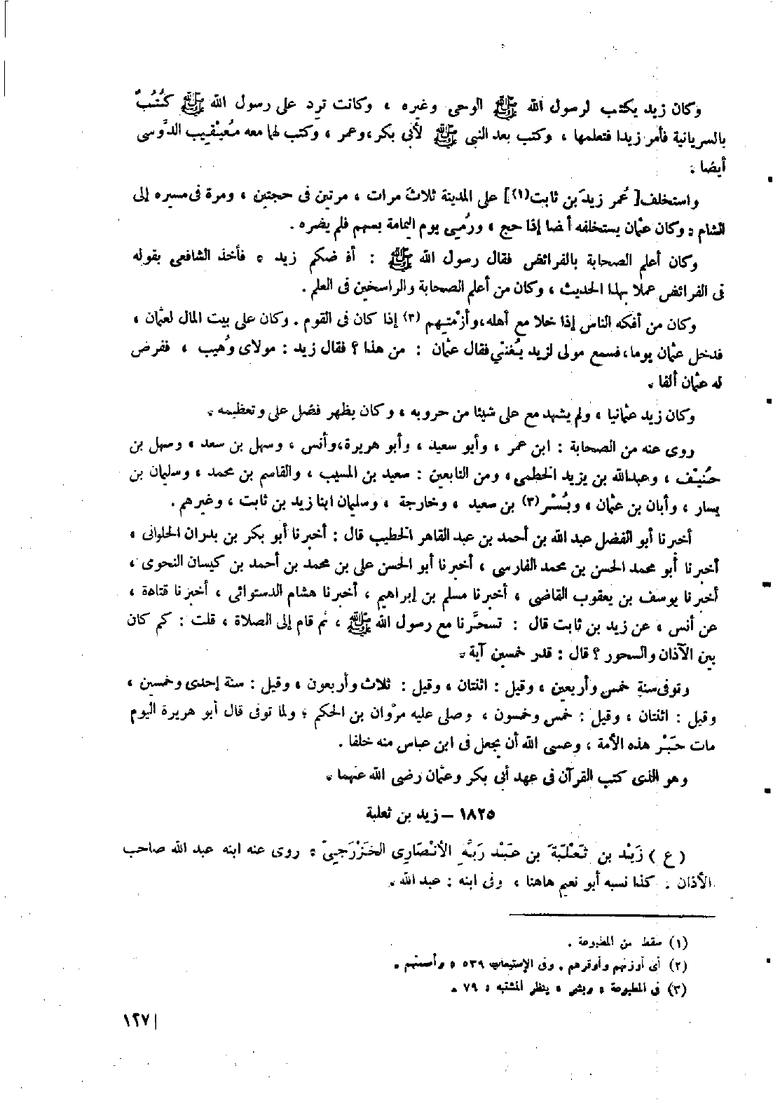 واستخلف [عمر زيد بْن ثابت [١] عَلَى المدينة ثلاث مرات، مرتين في حجتين، ومرة في مسيره إِلَى الشام. وكان عثمان يستخلفه أيضًا إذا حج، ورمي يَوْم اليمامة بسهم فلم يضره.