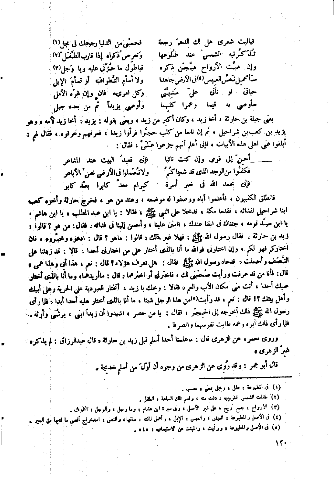زيد بْن حارثة. فقال رَسُول اللَّهِ صَلَّى اللَّهُ عَلَيْهِ وَسَلَّمَ فهلا غير ذلك. قَالُوا: ما هو؟ قال: ادعوه وخيروه، فإن اختاركم فهو لكم، وإن اختارني فو الله ما أنا بالذي أختار عَلَى من اختارني أحدًا. قالا: قد زدتنا عَلَى النصف وأحسنت. فدعاه رَسُول اللَّهِ صَلَّى اللَّهُ عَلَيْهِ وَسَلَّمَ فقال: هل تعرف هؤلاء؟ قال: نعم، هذا أَبِي وهذا عمي، قال: فأنا من قد عرفت ورأيت صحبتي لك، فاخترني أو اخترهما. قال: ما أريدهما، وما أنا بالذي أختار عليك أحدًا، أنت مني مكان الأب والعم. فقالا: ويحك يا زيد، أتختار العبودية عَلَى الحرية وعلى أبيك وأهل بيتك؟! قال: نعم، قد رأيت [٥] من هذا الرجل شيئًا، ما أنا بالذي أختار عليه أحدًا أبدًا، فَلَمَّا رَأَى رَسُول اللَّهِ صَلَّى اللَّهُ عَلَيْهِ وَسَلَّمَ ذلك أخرجه إِلَى الحجر، فقال: يا من حضر، اشهدوا أن زيدًا ابني، يرثني وأرثه، فلما رَأَى ذلك أبوه وعمه طابت نفوسهما وانصرفا. وروى معمر، عَنِ الزُّهْرِيّ قال: ما علمنا أحدًا أسلم قبل زيد بْن حارثة، قال عبد الرزاق: لم يذكره غير الزُّهْرِيّ.