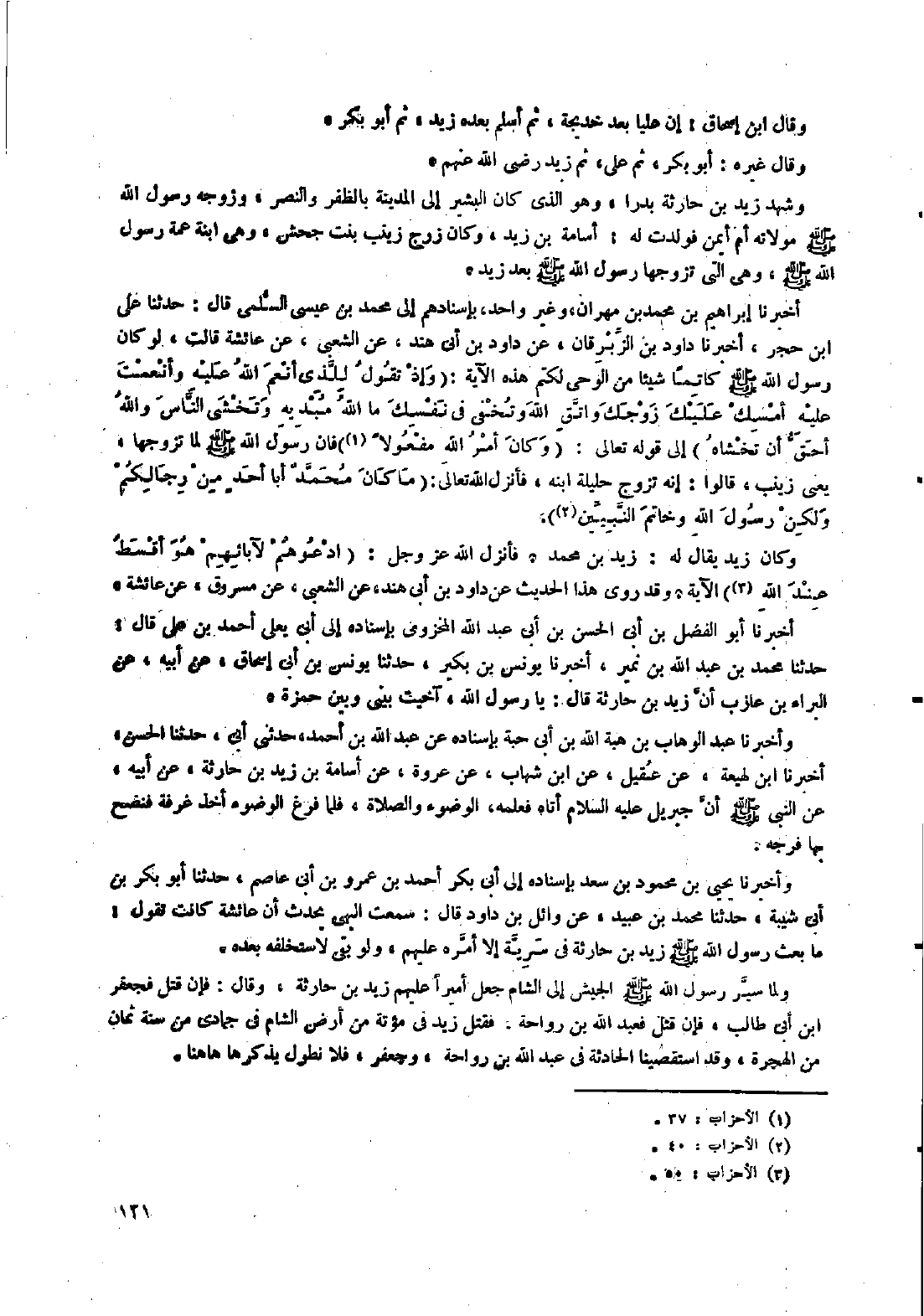 أَخْبَرَنَا إِبْرَاهِيمُ بْنُ مُحَمَّدِ بْنِ مِهْرَانَ، وَغَيْرُ وَاحِدٍ، بِإِسْنَادِهِمْ إِلَى مُحَمَّدِ بْنِ عِيسَى السلمي قال: حدثنا على ابن حُجْرٍ، أَخْبَرَنَا دَاوُدُ بْنُ الزِّبْرِقَانِ، عَنْ دَاوُدَ بْنِ أَبِي هِنْدٍ، عَنِ الشَّعْبِيِّ، عَنْ عَائِشَةَ قَالَتْ، لَوْ كَانَ رَسُول اللَّهِ صَلَّى اللَّهُ عَلَيْهِ وَسَلَّمَ كَاتِمًا شَيْئًا مِنَ الْوَحْيِ لَكَتَمَ هَذِهِ الآيَةَ: وَإِذْ تَقُولُ لِلَّذِي أَنْعَمَ اللَّهُ عَلَيْهِ وَأَنْعَمْتَ عَلَيْهِ أَمْسِكْ عَلَيْكَ زَوْجَكَ وَاتَّقِ اللَّهَ وَتُخْفِي فِي نَفْسِكَ مَا اللَّهُ مُبْدِيهِ وَتَخْشَى النَّاسَ وَالله أَحَقُّ أَنْ تَخْشاهُ ٣٣: ٣٧ إِلَى قوله تعالى: وَكانَ أَمْرُ اللَّهِ مَفْعُولًا [١] ٣٣: ٣٧ فإن رسول الله صلى الله عليه وسلم لَمَّا تَزَوَّجَهَا، يَعْنِي زَيْنَبَ، قَالُوا: إِنَّهُ تَزَوَّجَ حَلِيلَةَ ابْنِهِ، فَأَنْزَلَ اللَّهُ تَعَالَى: مَا كانَ مُحَمَّدٌ أَبا أَحَدٍ مِنْ رِجالِكُمْ وَلكِنْ رَسُولَ الله وَخاتَمَ النَّبِيِّينَ [٢] ٣٣: ٤٠.