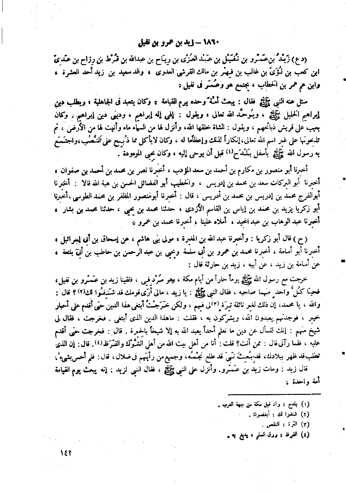 سئل عنه النَّبِيّ صَلَّى اللَّهُ عَلَيْهِ وَسَلَّمَ فقال: يبعث أمة وحده يَوْم القيامة. وكان يتعبد في الجاهلية، ويطلب دين إِبْرَاهِيم الخليل صَلَّى اللَّهُ عَلَيْهِ وَسَلَّمَ، ويوحد اللَّه تعالى، ويقول: إلهي إله إِبْرَاهِيم، وديني دين إِبْرَاهِيم. وكان يعيب عَلَى قريش ذبائحهم، ويقول: الشاة خلقها الله، وأنزل لها من السماء ماء وأنيت لها من الأرض، ثم تذبحونها عَلَى غير اسم الله تعالى، إنكارا لذلك وَإِعظامًا له، وكان لا يأكل مما ذبح عَلَى النصب، واجتمع به رَسُول اللَّهِ صَلَّى اللَّهُ عَلَيْهِ وَسَلَّمَ بأسفل بلدح [١] قبل أن يوحى إليه، وكان يحيى الموءودة.