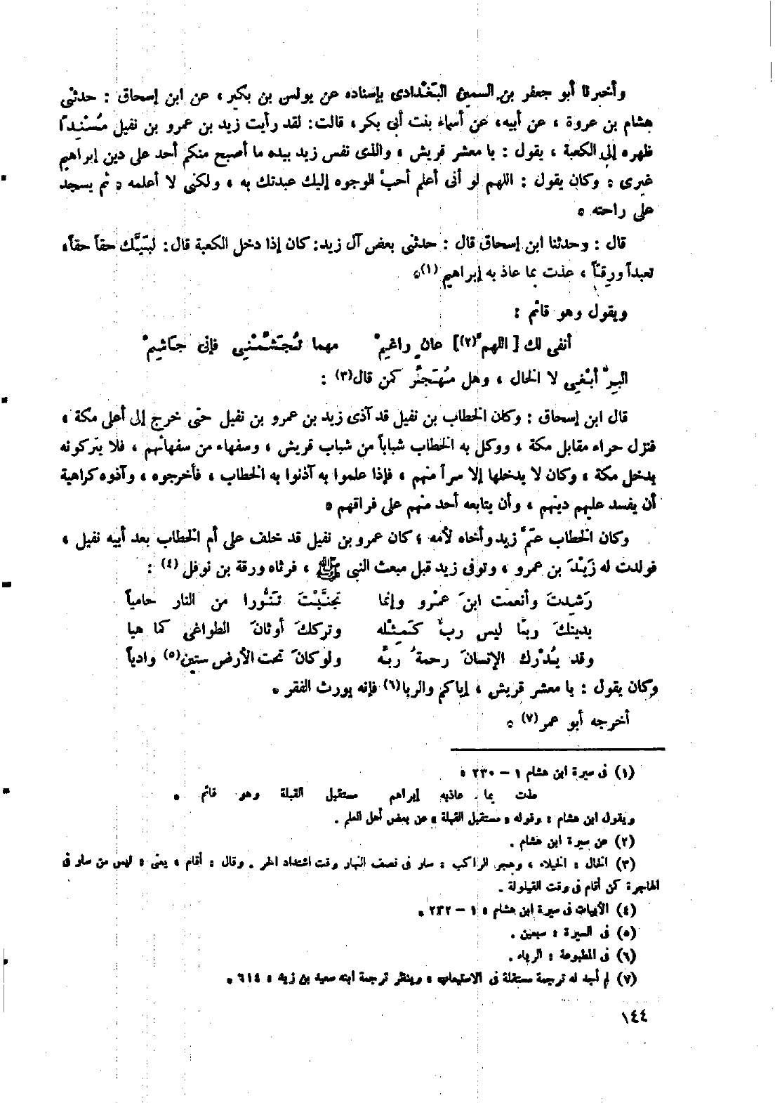 وأَخْبَرَنَا أَبُو جَعْفَرِ بْنُ السَّمِينِ الْبَغْدَادِيُّ بِإِسْنَادِهِ عن يونس بن بكير، عن ابن إسحاق: حَدَّثَنِي هِشَامُ بْنُ عُرْوَةَ، عَنْ أَبِيهِ، عَنْ أَسْمَاءَ بِنْتِ أَبِي بَكْرٍ، قَالَت: لَقَدْ رَأَيْتُ زَيْدَ بْنَ عَمْرِو بْنِ نُفَيْلٍ مُسْنِدًا ظَهْرَهُ إِلَى الْكَعْبَةِ، يَقُولُ: يَا مَعْشَرَ قُرَيْشٍ، وَالَّذِي نَفْسُ زَيْدٍ بِيَدِهِ مَا أَصْبَحَ مِنْكُمْ أَحَدٌ عَلَى دِينِ إِبْرَاهِيمَ غَيْرِي: وَكَانَ يَقُولُ: اللَّهمّ لَو أَنِّي أَعْلَمُ أَحَبَّ الْوُجُوهِ إِلَيْكَ عَبَدْتُكَ بِهِ، وَلَكِنِّي لا أَعْلَمُهُ، ثُمَّ يَسْجُدُ عَلَى رَاحَتِهِ.