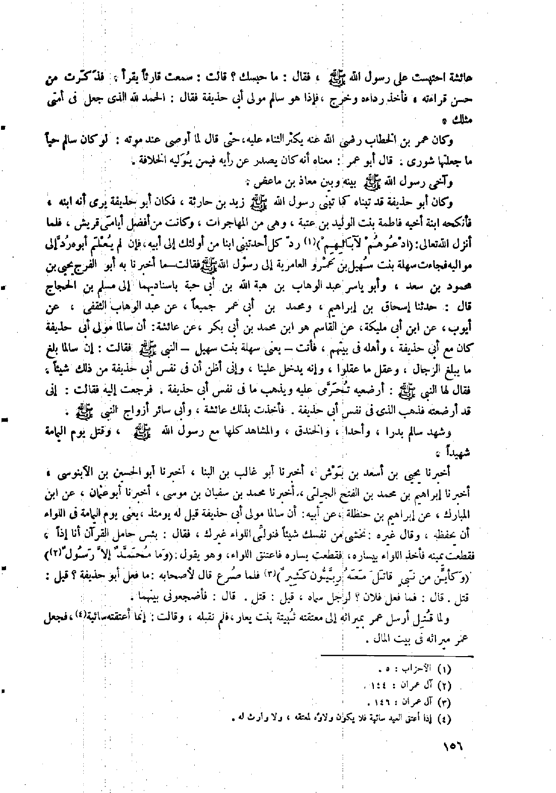 وكان أَبُو حذيفة قد تبناه كما تبنى رسول الله صلى الله عليه وسلم زيد بْن حارثة، فكان أَبُو حذيفة يرى أَنَّهُ ابنه، فأنكحه ابنة أخيه فاطمة بنت الْوَلِيد بْن عتبة، وهي من المهاجرات، وكانت من أفضل أيامى قريش، فلما أنزل اللَّه تعالى: ادْعُوهُمْ لِآبائِهِمْ ٣٣: ٥ [١] رد كل أحد تبنى ابنًا من أولئك إِلَى أبيه، فإن لم يعلم أبوه رد إِلَى مواليه فجاءت سهلة بنت سهيل بْن عمرو العامرية إِلَى رَسُول اللَّهِ صَلَّى اللَّهُ عَلَيْهِ وَسَلَّمَ فقالت- مَا أَخْبَرَنَا بِهِ أَبُو الْفَرَجِ يَحْيَى بْنُ مَحْمُودِ بْنِ سَعْدٍ، وَأَبُو يَاسِرٍ عَبْدُ الْوَهَّابِ بْنُ هِبَةِ اللَّهِ بْنِ أَبِي حَبَّةَ بِإِسْنَادَيْهِمَا إِلَى مُسْلِمِ بْنِ الْحَجَّاجِ قَالَ: حَدَّثَنَا إِسْحَاقُ بْنُ إِبْرَاهِيمَ، وَمُحَمَّدُ بْنُ أَبِي عُمَرَ جَمِيعًا، عَنْ عَبْدِ الْوَهَّابِ الثَّقَفِيِّ، عَنْ أَيُّوبَ، عَنِ ابْنِ أَبِي مُلَيْكَةَ، عَنِ القاسم هو ابن محمد بن أَبِي بَكْرٍ، عَنْ عَائِشَةَ: أَنَّ سَالِمًا مَوْلَى أَبِي حُذَيْفَةَ كَانَ مَعَ أَبِي حُذَيْفَةَ، وَأَهْلِهِ فِي بَيْتِهِمْ، فَأَتَتْ- يَعْنِي سَهْلَةَ بِنْتَ سُهَيْلٍ- النَّبِيَّ صَلَّى اللَّهُ عَلَيْهِ وَسَلَّمَ فَقَالَتْ: إِنَّ سَالِمًا بَلَغَ مَا يَبْلُغُ الرِّجَالُ، وَعَقَلَ مَا عَقَلُوا، وَإِنَّهُ يَدْخُلُ عَلَيْنَا، وَإِنِّي أَظُنُّ أَنَّ فِي نَفْسِ أَبِي حُذَيْفَةَ مِنْ ذَلِكَ شَيْئًا.