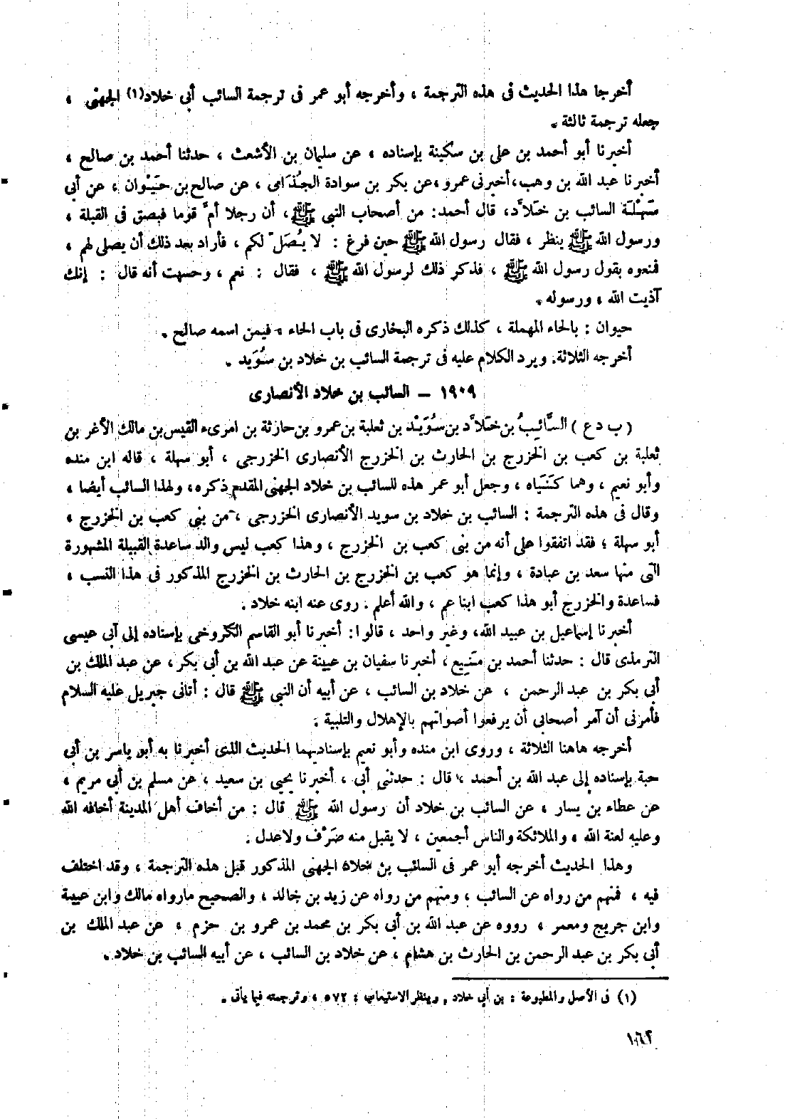 أخبرنا إسماعيل بن عبيد الله، وغير واحد، قَالُوا: أَخْبَرَنَا أَبُو الْقَاسِمِ الْكُرُوخِيُّ بِإِسْنَادِهِ إِلَى أَبِي عِيسَى التِّرْمِذِيِّ قَالَ: حَدَّثَنَا أَحْمَدُ بْنُ مَنِيعٍ، أَخْبَرَنَا سُفْيَانُ بْنُ عُيَيْنَةَ عَنْ عَبْدِ اللَّهِ بْنِ أَبِي بَكْرٍ، عَنْ عَبْدِ الْمَلِكِ بْنِ أَبِي بَكْرِ بْنِ عَبْدِ الرَّحْمَنِ، عَنْ خَلادِ بْنِ السَّائِبِ، عَنْ أَبِيهِ أَنَّ النَّبِيَّ صلى الله عليه وسلم قال: أتاني جبريل عَلَيْهِ السَّلامُ فَأَمَرَنِي أَنْ آمُرَ أَصْحَابِي أَنْ يَرْفَعُوا أَصْوَاتَهُمْ بِالإِهْلالِ وَالتَّلْبِيَةِ. أَخْرَجَهُ هَا هُنَا الثَّلاثَةُ، وروى ابن منده وَأَبُو نعيم بإسناديهما الحديث الذي أَخْبَرَنَا بِهِ أَبُو يَاسِرِ بْنُ أَبِي حَبَّةَ بِإِسْنَادِهِ إلى عبد الله بن أحمد، قال: حدثني أبي، أخبرنا يحيى بن سعيد، عن مسلم بن أبي مريم، عن عَطَاءِ بْنِ يَسَارٍ، عَنْ السَّائِبِ بْنِ خَلادٍ أن رسول الله صلى الله عليه وسلم قَالَ: مَنْ أَخَافَ أَهْلَ الْمَدِينَةِ أَخَافَهُ اللَّهُ وعليه لعنة الله، والملائكة والناس أجمعين، لا يُقْبَلُ مِنْهُ صَرْفٌ وَلا عَدْلٌ.