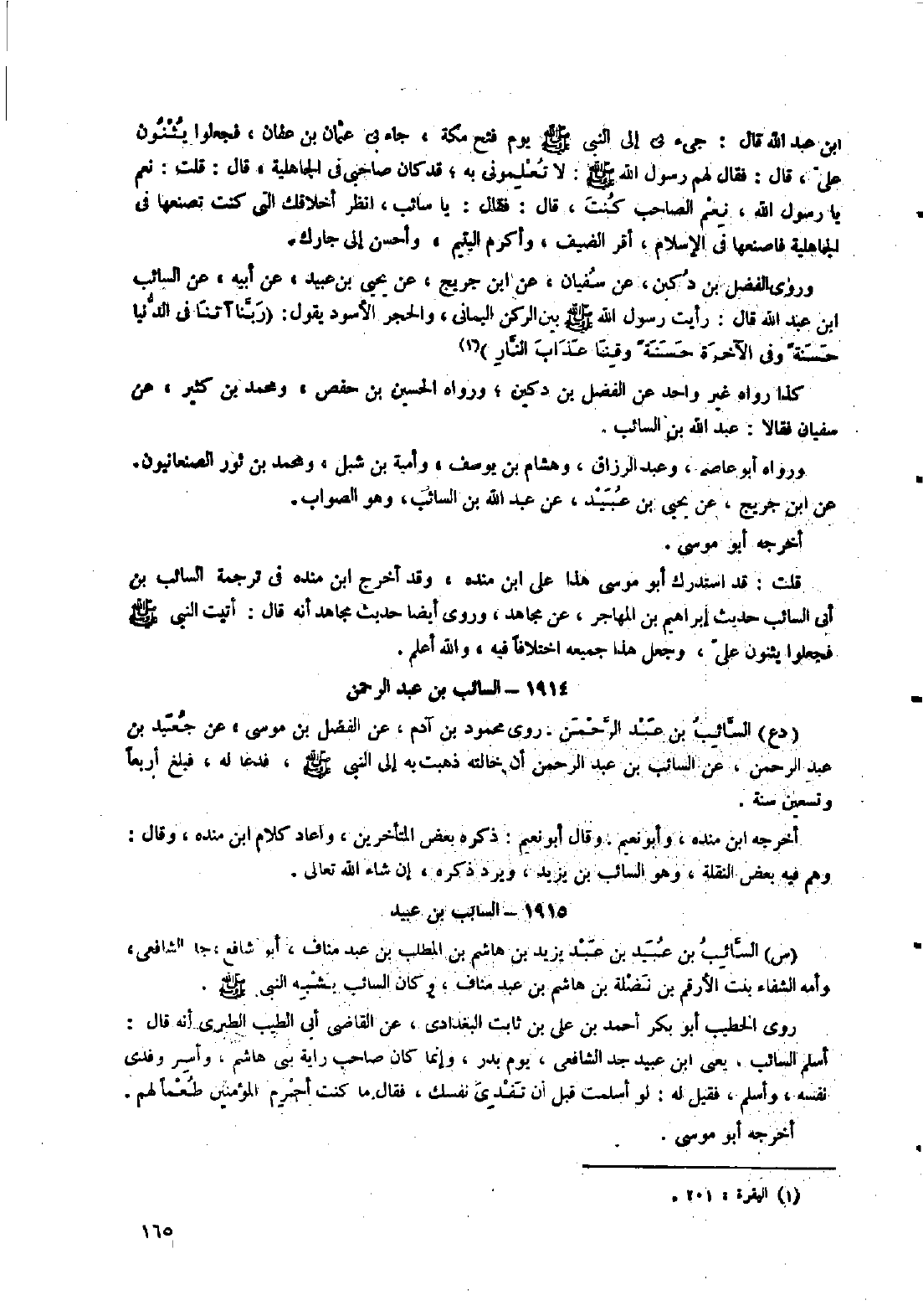 ابن عَبْدِ اللَّهِ قَالَ: جِيءَ بِي إِلَى النَّبِيِّ صَلَّى اللَّهُ عَلَيْهِ وَسَلَّمَ يَوْمَ فَتْحِ مَكَّةَ، جَاءَ بِي عُثْمَانُ بْنُ عَفَّانَ، فَجَعَلُوا يَثْنُونَ عَلَيَّ، قَالَ: فَقَالَ لَهُمْ رَسُول اللَّهِ صَلَّى اللَّهُ عَلَيْهِ وَسَلَّمَ: لا تُعْلِمُونِي بِهِ، قَدْ كَانَ صَاحِبِي فِي الْجَاهِلِيَّةِ، قَالَ: قُلْتُ: نَعَمْ يَا رَسُول اللَّهِ، نِعْمَ الصَّاحِبُ كُنْتَ، قَالَ: فَقَالَ: يَا سَائِبُ، انْظُرْ أَخْلاقَكَ الَّتِي كُنْتَ تَصْنَعُهَا فِي الْجَاهِلِيَّةِ فَاصْنَعْهَا فِي الإِسْلامِ، أَقِرَّ الضَّيْفَ، وَأَكْرِمِ الْيَتِيمَ، وَأَحْسِنْ إِلَى جَارِكَ. وروى الفضل بْن دكين، عَنْ سفيان، عَنِ ابن جريج، عَنْ يَحيى بْن عُبَيْد، عَنْ أَبِيهِ، عَنْ السائب ابن عَبْد اللَّهِ قَالَ: رَأَيْتُ رَسُول اللَّهِ صَلَّى اللَّهُ عَلَيْهِ وَسَلَّمَ بين الركن اليماني، والحجر الأسود يقول: رَبَّنا آتِنا فِي الدُّنْيا حَسَنَةً وَفي الْآخِرَةِ حَسَنَةً وَقِنا عَذابَ النَّارِ ٢: ٢٠١ [١] كذا رواه غير واحد عَنِ الفضل بْن دكين، ورواه الحسين بْن حفص، ومحمد بْن كثير، عَنْ سفيان فقالا: عَبْد اللَّهِ بْن السائب.