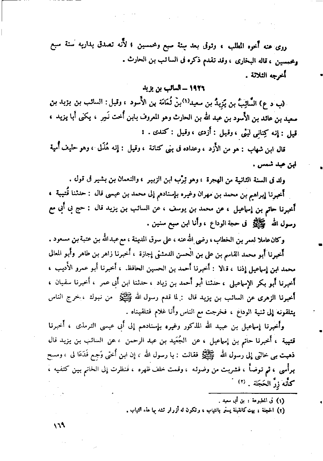 (ب د ع) السائب بْن يَزِيدَ بْن سَعِيد [١] بْن ثمامة بْن الأسود، وقيل: السائب بْن يَزِيدَ بْن سَعِيد بْن عائد بْن الأسود بْن عَبْد اللَّهِ بْن الحارث وهو المعروف بابن أخت نمر، يكنى أبا يزيد، قيل: إنه كناني ليثي، وقيل: أزدي، وقيل: كندي.: