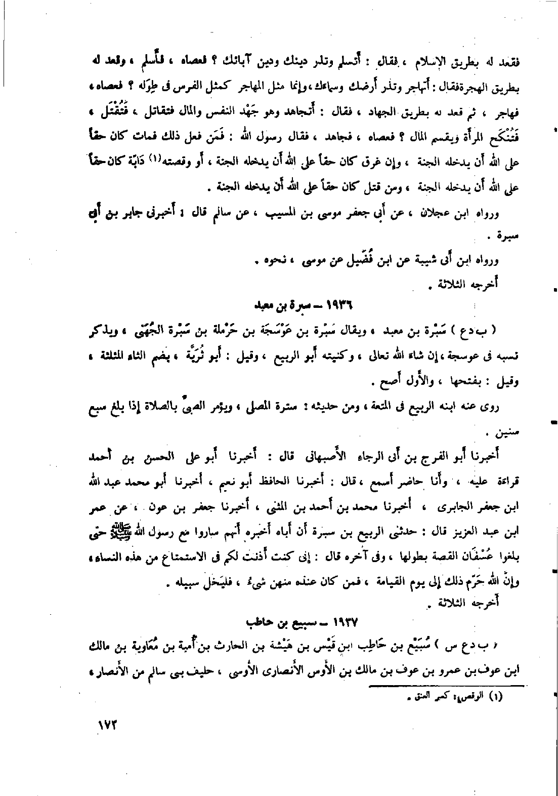 أَخْبَرَنَا أَبُو الْفَرَجِ بْنُ أَبِي الرَّجَاءِ الأَصْبَهَانِيُّ قَالَ: أَخْبَرَنَا أَبُو عَلِيٍّ الْحَسَنُ بْنُ أَحْمَدَ قِرَاءَةً عَلَيْهِ، وَأَنَا حَاضِرٌ أَسْمَعُ، قَالَ: أَخْبَرَنَا الْحَافِظُ أَبُو نُعَيْمٍ، أخبرنا أبو محمد عبد الله ابن جَعْفَرٍ الْجَابِرِيُّ، أَخْبَرَنَا مُحَمَّدُ بْنُ أَحْمَدَ بْنِ الْمُثَنَّى، أَخْبَرَنَا جَعْفَرُ بْنُ عَوْنٍ، عَنْ عُمَرَ ابن عَبْدِ الْعَزِيزِ قَالَ: حَدَّثَنِي الرَّبِيعُ بْنُ سَبْرَةَ أَنَّ أَبَاهُ أَخْبَرَهُ أَنَّهُمْ سَارُوا مَعَ رَسُول اللَّهِ صَلَّى اللَّهُ عَلَيْهِ وَسَلَّمَ حَتَّى بَلَغُوا عُسْفَانَ الْقِصَّةَ بِطُولِهَا، وفِي آخِرِهِ قَالَ: إِنِّي كُنْتُ أَذِنْتُ لَكُمْ فِي الاسْتِمْتَاعِ مِنْ هَذِهِ النِّسَاءِ، وَإِنَّ اللَّهَ حَرَّمَ ذَلِكَ إِلَى يَوْمِ الْقِيَامَةِ، فَمَنْ كَانَ عِنْدَهُ مِنْهُنَّ شَيْءٌ، فَلْيُخَلِّ سبيله.