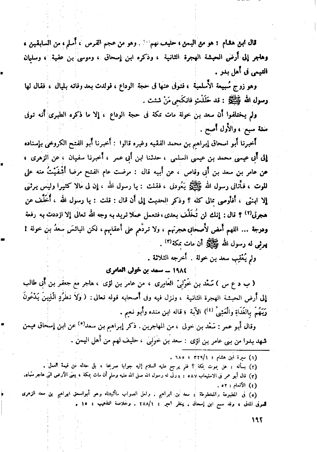 أَخْبَرَنَا أَبُو إِسْحَاقَ إِبْرَاهِيمُ بْنُ مُحَمَّدٍ الْفَقِيهُ وَغَيْرُهُ قَالُوا: أَخْبَرَنَا أَبُو الْفَتْحِ الْكَرُوخِيُّ بِإِسْنَادِهِ إِلَى أَبِي عِيسَى مُحَمَّدِ بْنِ عِيسَى السُّلَمِيِّ، حَدَّثَنَا ابْنُ أَبِي عُمَرَ، أَخْبَرَنَا سُفْيَانُ، عَنِ الزُّهْرِيِّ، عَنْ عَامِرِ بْنِ سَعْدِ بْنِ أَبِي وَقَّاصٍ، عَنْ أَبِيهِ قَالَ: مَرِضْتُ عَامَ الْفَتْحِ مَرَضًا أُشْفِيتُ مِنْهُ عَلَى الْمَوْتِ، فَأَتَانِي رَسُول اللَّهِ صَلَّى اللَّهُ عَلَيْهِ وَسَلَّمَ يَعُودُنِي، فَقُلْتُ: يَا رَسُول اللَّهِ، إِنَّ لِي مَالًا كَثِيرًا وَلَيْسَ يَرِثُنِي إِلا ابْنَتِي، أَفَأُوصِي بِمَالِي كُلِّهِ؟ وذَكَرَ الْحَدِيثَ إِلَى أَنْ قَالَ: قُلْتُ: يَا رَسُول اللَّهِ، أُخَلَّفُ عَنْ هِجْرَتِي [٢] ؟ قَالَ: إِنَّكَ لَنْ تُخَلَّفَ بَعْدِي، فَتَعْمَلُ عَمَلًا تُرِيدُ بِهِ وَجْهَ اللَّهِ تَعَالَى إِلا ازْدَدْتَ بِهِ رِفْعَةً وَدَرَجَةً ... اللَّهمّ أَمْضِ لأَصْحَابِي هِجْرَتَهُمْ، وَلا تَرُدَّهُمْ عَلَى أَعْقَابِهِمْ، لَكِنَّ الْبَائِسَ سَعْدُ بْنُ خَوْلَةَ! يُرْثِي لَهُ رَسُول اللَّهِ صَلَّى اللَّهُ عَلَيْهِ وَسَلَّمَ أَنْ مَاتَ بِمَكَّةَ [٣] . وَلَمْ يعقب سعد بن خولة. أخرجه الثلاثة.
