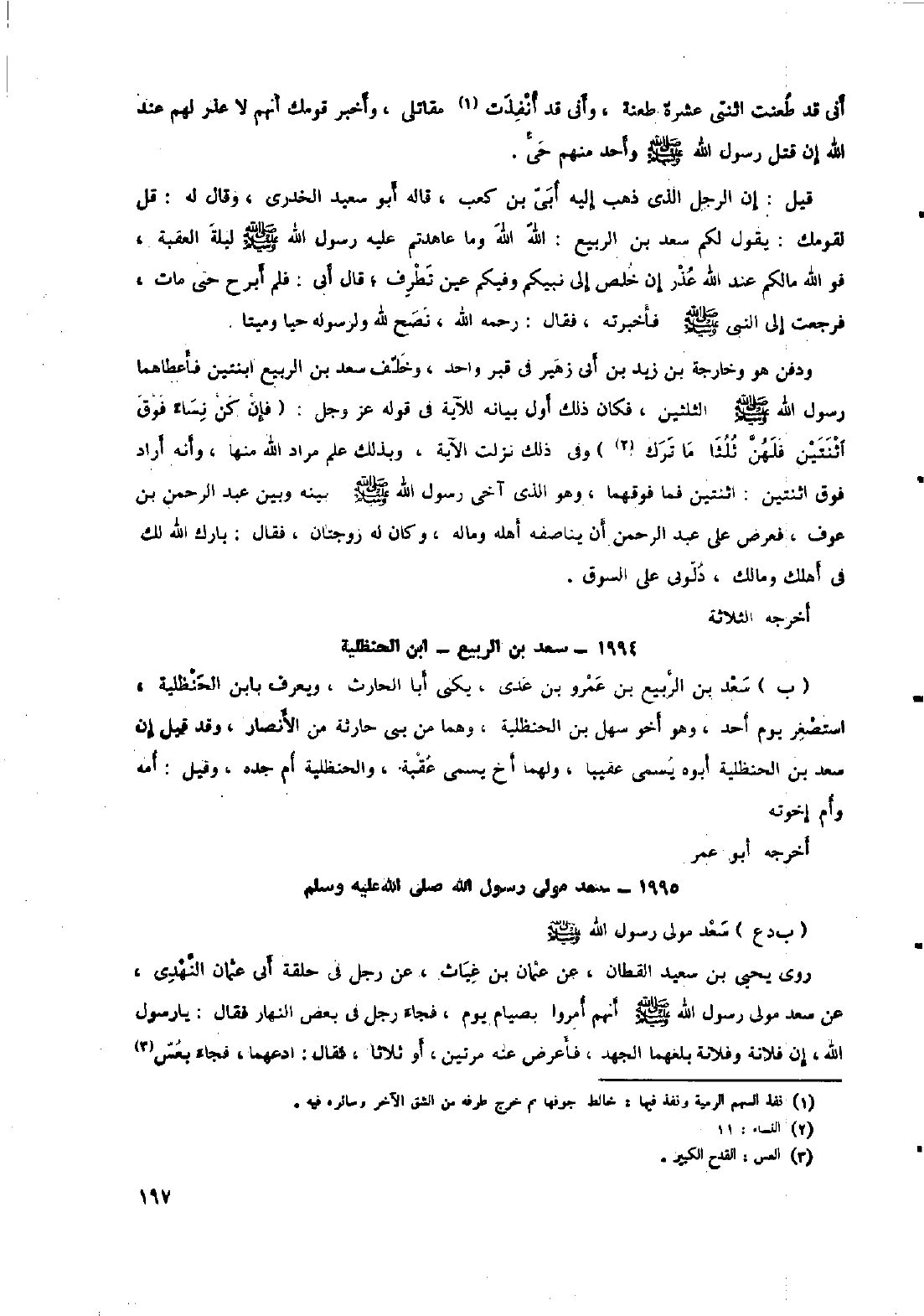 أَنِّي قَدْ طُعِنْتُ اثْنَتَيْ عَشْرَةَ طَعْنَةً، وَإِنِّي قَدْ أُنْفِذَتْ [١] مَقَاتِلِي، وَأَخْبِرْ قَوْمَكَ أَنَّهُمْ لا عُذْرَ لَهُمْ عِنْدَ اللَّهِ إِنْ قُتِلَ رَسُول اللَّهِ صَلَّى اللَّهُ عَلَيْهِ وَسَلَّمَ وأَحَدٌ مِنْهُمْ حَيٌّ. قيل: إن الرجل الذي ذهب إليه أَبِي بْن كعب، قاله أَبُو سَعِيد الخدري، وقال له: قل لقومك: يقول لكم سعد بْن الربيع: اللَّه الله وما عاهدتم عليه رسول الله صلى الله عليه وسلم ليلة العقبة، فو الله ما لكم عند اللَّه عذر إن خلص إِلَى نبيكم وفيكم عين تطرف، قال أَبِي: فلم أبرح حتى مات، فرجعت إِلَى النَّبِيّ صَلَّى اللَّهُ عَلَيْهِ وَسَلَّمَ فأخبرته، فقال: رحمه اللَّه، نصح للَّه ولرسوله حيًّا وميتًا.