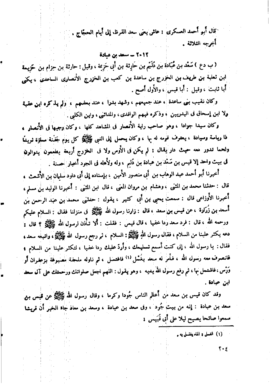 دَعْهُ يُكْثِرُ عَلَيْنَا مِنَ السَّلامِ، فَقَالَ رَسُول اللَّهِ صَلَّى اللَّهُ عَلَيْهِ وَسَلَّمَ: السَّلامَ، ثُمَّ رَجَعَ رَسُول اللَّهِ صَلَّى اللَّهُ عَلَيْهِ وَسَلَّمَ، واتَّبَعَهُ سَعْدٌ، فَقَالَ: يَا رَسُول اللَّهِ، إِنِّي كُنْتُ أَسْمَعُ تَسْلِيمَكَ، وَأَرُدُّ عليك ردا خفيا، لتكثر علينا من السَّلامَ، فَانْصَرَفَ مَعَهُ رَسُول اللَّهِ، فَأَمَرَ لَهُ سَعْدٌ بِغُسْلٍ [١] فَاغْتَسَلَ، ثُمَّ نَاوَلَهُ مَلْحَفَةً مَصْبُوغَةً بِزَعْفَرَانٍ أَوْ وَرْسٍ، فَاشْتَمَلَ بِهَا، ثُمَّ رَفَعَ رَسُول اللَّهِ يَدَيْهِ، وَهُوَ يَقُولُ: اللَّهمّ اجْعَلْ صلواتك ورحمتك على آل سعد ابن عُبَادَةَ. وقد كان قيس بْن سعد من أعظم الناس جودًا وكرمًا، وقال رَسُول اللَّهِ صَلَّى اللَّهُ عَلَيْهِ وَسَلَّمَ عَنْ قيس بْن سعد بْن عبادة: إنه من بيت جود، وفي سعد بْن عبادة، وسعد بْن معاذ جاء الخبر أن قريشًا سمعوا صائحًا يصيح ليلا على أبى قيس: