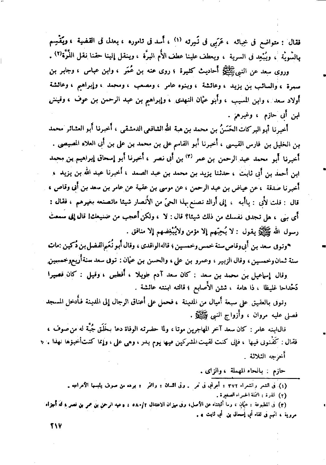 أَيْ بُنَيَّ، هَلْ تَجِدُ فِي نَفْسِكَ مِنْ ذَلِكَ شَيْئًا؟ قَال: لا، وَلَكِنْ أَعْجَبُ مِنْ صَنِيعِكَ! قَالَ إِنِّي سَمِعْتُ رَسُول اللَّهِ صَلَّى اللَّهُ عليه وسلم يقول: لا يُحِبُّهُمْ إِلا مُؤْمِنٌ وَلا يَبْغَضُهُمْ إِلا مُنَافِقٌ. وتوفي سعد بْن أَبِي وقاص سنة خمس وخمسين، قاله الواقدي، وقال أَبُو نعيم الفضل بْن دكين: مات سنة ثمان وخمسين، وقال الزبير، وعمرو بْن عَلِيٍّ، والحسن بْن عثمان: توفي سعد سنة أربع وخمسين وقال إِسْمَاعِيل بْن مُحَمَّدِ بْنِ سعد: كان سعد آدم طويلًا، أفطس، وقيل: كان قصيرًا دحداحًا غليظًا، ذا هامة، شثن الأصابع، قالته ابنته عائشة.
