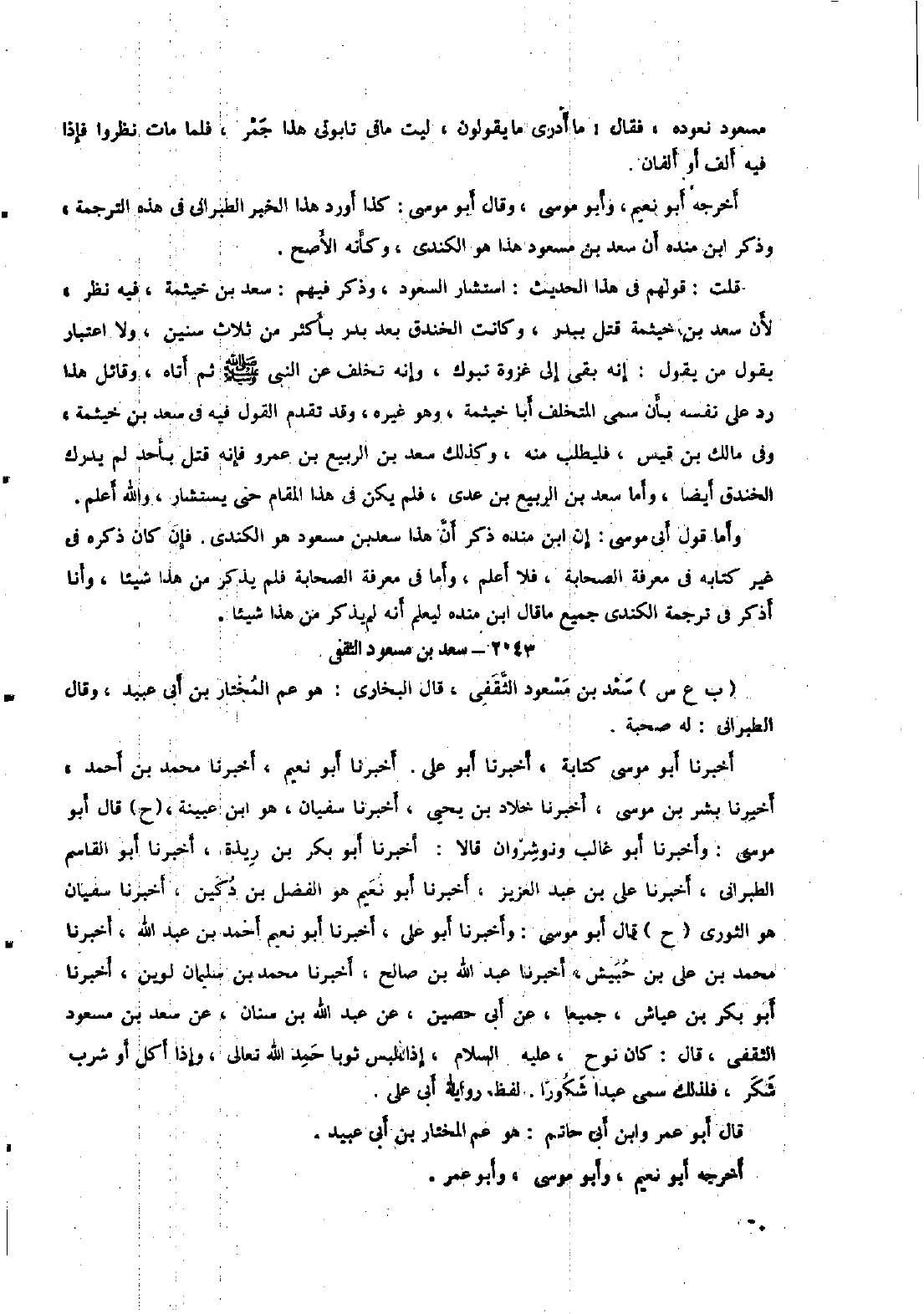 وأما قول أَبِي موسى: إن ابن منده ذكر أن هذا سعد بْن مسعود هو الكندي. فإن كان ذكره في غير كتابه في معرفة الصحابة، فلا أعلم، وأما في معرفة الصحابة فلم يذكر من هذا شيئًا، وأنا اذكر في ترجمة الكندي جميع ما قال ابن منده ليعلم أَنَّهُ لم يذكر من هذا شيئًا.