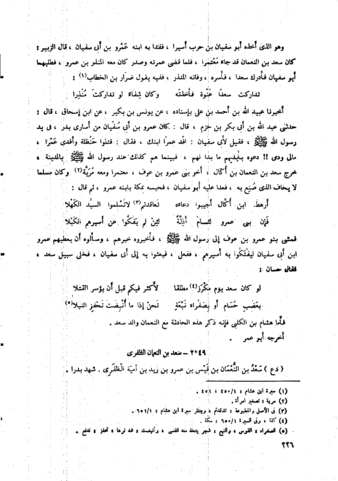 حدثني عَبْدُ اللَّهِ بْنُ أَبِي بَكْرِ بْنِ حَزْمٍ، قَالَ: كَانَ عَمْرُو بْنُ أَبِي سُفْيَانَ مِنْ أَسَارَى بَدْرٍ، فِي يَدِ رَسُول اللَّهِ صَلَّى اللَّهُ عَلَيْهِ وَسَلَّمَ، فَقِيلَ لأَبِي سُفْيَانَ: افْدِ عَمْرًا ابْنَكَ، فَقَالَ: قَتَلُوا حَنْظَلَةَ وَأَفْدِي عَمْرًا، مَالِي وَدَمِي!! دَعُوهُ بِأَيْدِيهِمْ مَا بَدَا لَهُمْ، فَبَيْنَمَا هُمْ كَذَلِكَ عِنْدَ رَسُول اللَّهِ صَلَّى اللَّهُ عَلَيْهِ وَسَلَّمَ بِالْمَدِينَةِ، خَرَجَ سَعْدُ بْنُ النُّعْمَانِ بْنِ أُكَّالٍ، أَخُو بَنِي عَمْرِو بْنِ عَوْفٍ، مُعْتَمِرًا وَمَعَهُ مُرَيَّةٌ [٢] وَكَانَ مُسْلِمًا لا يَخَافُ الَّذِي صُنِعَ بِهِ، فَعَدَا عَلَيْهِ أَبُو سُفْيَانَ، فَحَبَسَهُ بِمَكَّةَ بِابْنِهِ عَمْرٍو، ثُمَّ قَالَ: