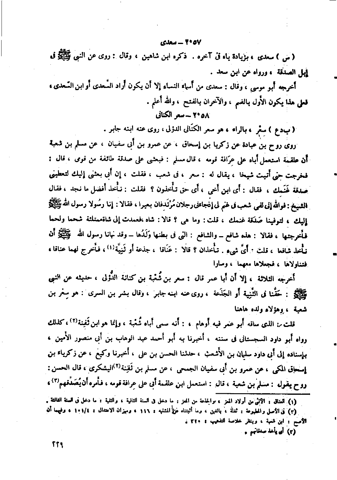 فخرجت حتى أتيت شيخًا، يقال له: سعر، في شعب، فقلت، إن أَبِي بعثني إليك لتعطيني صدقة غنمك، فقال: أي ابن أخي، أي حق تأخذون؟ فقلت: نأخذ أفضل ما نجد، فقال الشيخ: فو الله إني لفي شعب في غنم لي إذ جاءني رجلان مرتدفان بعيرًا، فقالا: إنا رسولا رسول الله صلى الله عليه وسلم إليك، لتوفينا صدقة غنمك، قلت: وما هي؟ قالا: شاة، فعمدت إِلَى شاة ممتلئة شحمًا ولحمًا فأخرجتها، فقالا: هذه شافع- والشافع: التي في بطنها ولدها- وقد نهانا رَسُول اللَّهِ صَلَّى اللَّهُ عَلَيْهِ وسلم إن تأخذ شافعًا، قلت: أي شيء. تأخذان؟ قالا: عناقًا، جذعة أو ثنية [١] ، فأخرج لهما عناقًا، فتناولاها، فجعلاها معهما، وسارا أخرجه الثلاثة، إلا أن أبا عمر قال: سعر بْن شعبة بْن كنانة الدؤلي، حديثه عَنِ النَّبِيّ صَلَّى اللَّهُ عَلَيْهِ وَسَلَّمَ: حقنا في الثنية أو الجذعة، روى عنه ابنه جابر، وقال بشر بْن السري: هو سعر بْن شعبة، وهؤلاء ولده هاهنا قلت: الذي ساقه أَبُو عمر فيه أوهام،: أَنَّهُ سمى أباه شعبة، وَإِنما هو ابن ثفنة [٢] ، كذلك رواه أَبُو داود السجستاني في سننه، أَخْبَرَنَا بِهِ أَبُو أَحْمَدَ عَبْدُ الْوَهَّابِ بْنُ أَبِي مَنْصُورِ الأَمِينُ، بِإِسْنَادِهِ إِلَى أَبِي دَاوُدَ سُلَيْمَانَ بْنِ الأَشْعَثِ، حَدَّثَنَا الْحَسَنُ بْنُ على، أخبرنا وكيع، عن زكريا بْنِ إِسْحَاقَ الْمَكِّيِّ، عَنْ عَمْرِو بْنِ أَبِي سُفْيَانَ الْجُمَحِيِّ، عَنْ مُسْلِمِ بْنِ ثَفِنَةَ [٢] الْيَشْكُرِيِّ، قَالَ الْحَسَنُ: