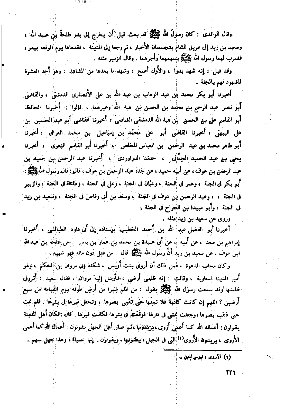 أَخْبَرَنَا أَبُو الْفَضْلِ عَبْدُ اللَّهِ بْنُ أَحْمَدَ الْخَطِيبُ بِإِسْنَادِهِ إِلَى أَبِي دَاوُدَ الطَّيَالِسِيِّ، أَخْبَرَنَا إِبْرَاهِيمُ بْنُ سَعْدٍ، عَنْ أَبِيهِ، عَنْ أَبِي عُبَيْدَةَ بْنِ مُحَمَّدِ بْنِ عَمَّارِ بْنِ يَاسِرٍ. عَنْ طَلْحَةَ بن عبد الله ابن عَوْفٍ، عَنْ سَعِيدِ بْنِ زَيْدٍ أَنَّ رَسُول الله صلى الله عليه وسلم قَالَ: مَنْ قُتِلَ دُونَ مَالِهِ فَهُوَ شَهِيدٌ. وكان مجاب الدعوة، فمن ذلك أن أروى بنت أويس، شكته إِلَى مروان بْن الحكم، وهو أمير الْمدينة لمعاوية، وقالت: إنه ظلمني أرضي، فأرسل إليه مروان، فقال سَعِيد: أتروني ظلمتها وَقَدْ سَمِعْتُ رَسُول اللَّه صَلَّى اللَّهُ عَلَيْهِ وسلم يقول: من ظلم شبرًا من أرض طوقه يَوْم القيامة من سبع أرضين؟ اللَّهمّ إن كانت كاذبة فلا تمتها حتى تعمي بصرها، وتجعل قبرها في بئرها. فلم تمت حتى ذهب بصرها، وجعلت تمشي في دارها فوقعت في بئرها فكانت قبرها. قال: فكان أهل المدينة يقولون: أعماك اللَّه كما أعمى أروى، يزيدونها، ثم صار أهل الجهل يقولون: أعماك اللَّه كما أعمى الأروى، يريدون الأروى [١] التي في الجبل، يظنونها، ويقولون: إنها عمياء، وهذا جهل منهم.