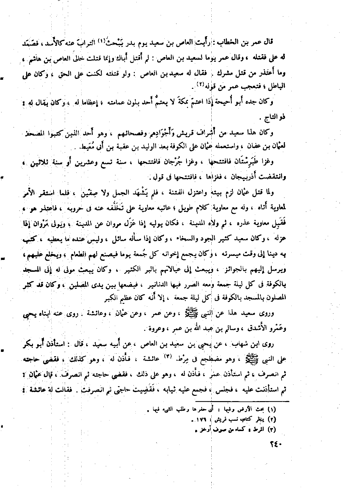 قال عمر بْن الخطاب: رأيت العاص بْن سَعِيد يَوْم بدر يبحث [١] التراب عنه كالأسد، فصمد له علي فقتله، وقال عمر يومًا لسعيد بْن العاص: لم أقتل أباك وَإِنما قتلت خالي العاص بن هاشم، وما أعتذر من قتل مشرك. فقال له سَعِيد بْن العاص: ولو قتلته لكنت عَلَى الحق، وكان عَلَى الباطل فتعجب عمر من قوله [٢] .