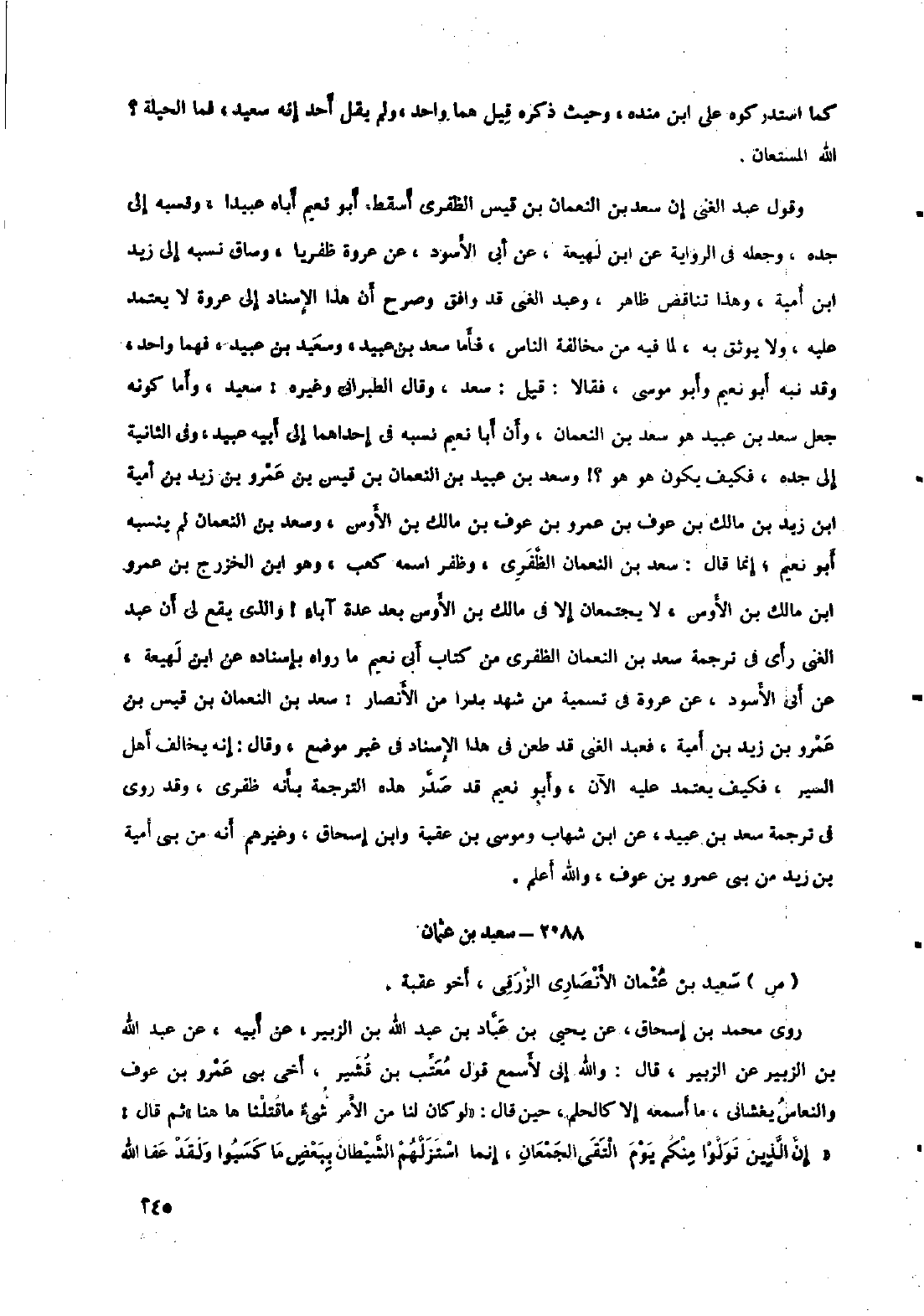 وقول عبد الغني إن سعد بْن النعمان بْن قيس الظفري أسقط أَبُو نعيم أباه عبيدًا، ونسبه إِلَى جده، وجعله في الرواية عَنِ ابن لهيعة، عَنْ أَبِي الأسود، عَنْ عروة ظفريًا، وساق نسبه إلى زيد ابن أمية، وهذا تناقض ظاهر، وعبد الغني قد وافق وصرح أن هذا الإسناد إِلَى عروة لا يعتمد عليه، ولا يوثق به، لما فيه من مخالفة الناس، فأما سعد بْن عبيد، وسعيد بْن عبيد، فهما واحد، وقد نبه أَبُو نعيم وَأَبُو موسى، فقالا: قيل: سعد، وقال الطبراني وغيره: سَعِيد، وأما كونه جعل سعد بْن عبيد هو سعد بْن النعمان، وأن أبا نعيم نسبه في إحداهما إِلَى أبيه عبيد، وفي الثانية إِلَى جده، فكيف يكون هو هو؟! وسعد بْن عُبَيْد بْن النعمان بْن قيس بْن عمرو بْن زيد بْن أمية ابن زيد بْن مالك بْن عوف بْن عمرو بْن عوف بْن مالك بْن الأوس، وسعد بْن النعمان لم ينسبه أَبُو نعيم إنما قال: سعد بْن النعمان الظفري، وظفر اسمه كعب، وهو ابن الخزرج بْن عمرو ابن مالك بْن الأوس، لا يجتمعان إلا في مالك بْن الأوس بعد عدة آباء! والذي يقع لي أن عبد الغني رَأَى في ترجمة سعد بْن النعمان الظفري من كتاب أَبِي نعيم ما رواه بِإِسْنَادِهِ عَنِ ابن لهيعة، عَنْ أَبِي الأسود، عَنْ عروة في تسمية من شهد بدرا من الأنصار: سعد بْن النعمان بْن قيس بْن عَمْرو بْن زيد بْن أمية، فعبد الغني قد طعن في هذا الإسناد في غير موضع، وقال: إنه يخالف أهل السير، فكيف يعتمد عليه الآن، وَأَبُو نعيم قد صدر هذه الترجمة بأنه ظفري، وقد روى في ترجمة سعد بْن عبيد، عَنِ ابن شهاب وموسى بْن عقبة وابن إِسْحَاق، وغيرهم أَنَّهُ من بني أمية بْن زيد من بني عمرو بْن عوف، والله أعلم.