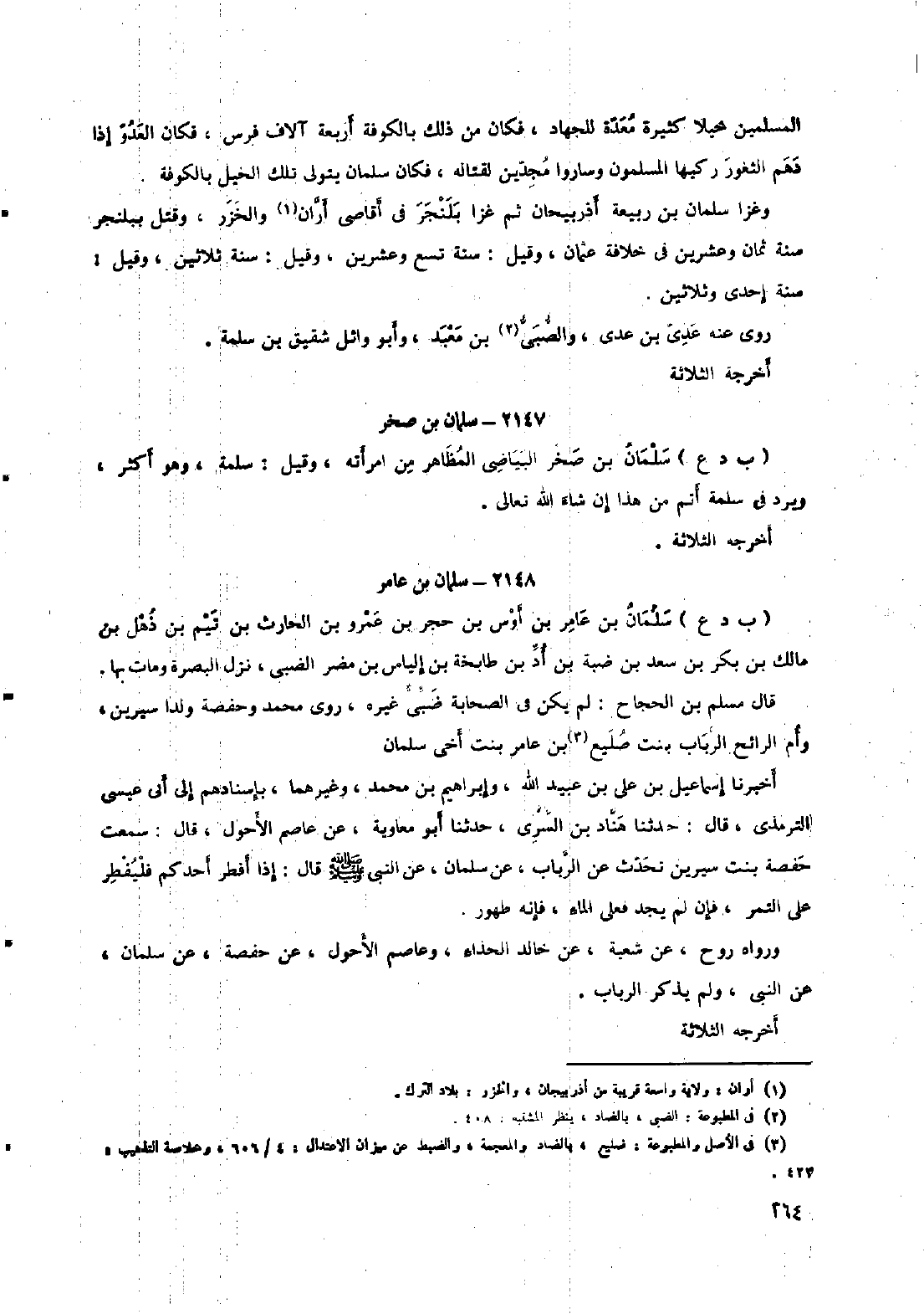 قال مسلم بْن الحجاج: لم يكن في الصحابة ضبي غيره، روى مُحَمَّد وحفصة ولدا سيرين، وأم الرائح الرباب بنت صليع [٣] بْن عامر بنت أخي سلمان أَخْبَرَنَا إِسْمَاعِيل بْنُ عَلِيِّ بْنِ عُبَيْدِ اللَّهِ، وَإِبْرَاهِيمُ بْنُ مُحَمَّدٍ، وَغَيْرُهُمَا، بِإِسْنَادِهِم إِلَى أَبِي عِيسَى التِّرْمِذِيِّ، قَالَ: حَدَّثَنَا هَنَّادُ بْنُ السَّرِيِّ، حَدَّثَنَا أَبُو مُعَاوِيَةَ، عَنْ عَاصِمٍ الأَحْوَلِ، قال: سمعت حفصة بنت سيرين تحدّث عن الرَّبَابَ، عَنْ سَلْمَانَ، عَنِ النَّبِيِّ صَلَّى اللَّهُ عَلَيْهِ وَسَلَّمَ قَالَ: إِذَا أَفْطَرَ أَحَدُكُمْ فَلْيُفْطِرْ عَلَى التَّمْرِ، فَإِنْ لَمْ يَجِدْ فَعَلَى الْمَاءِ، فَإِنَّهُ طَهُوٌر.