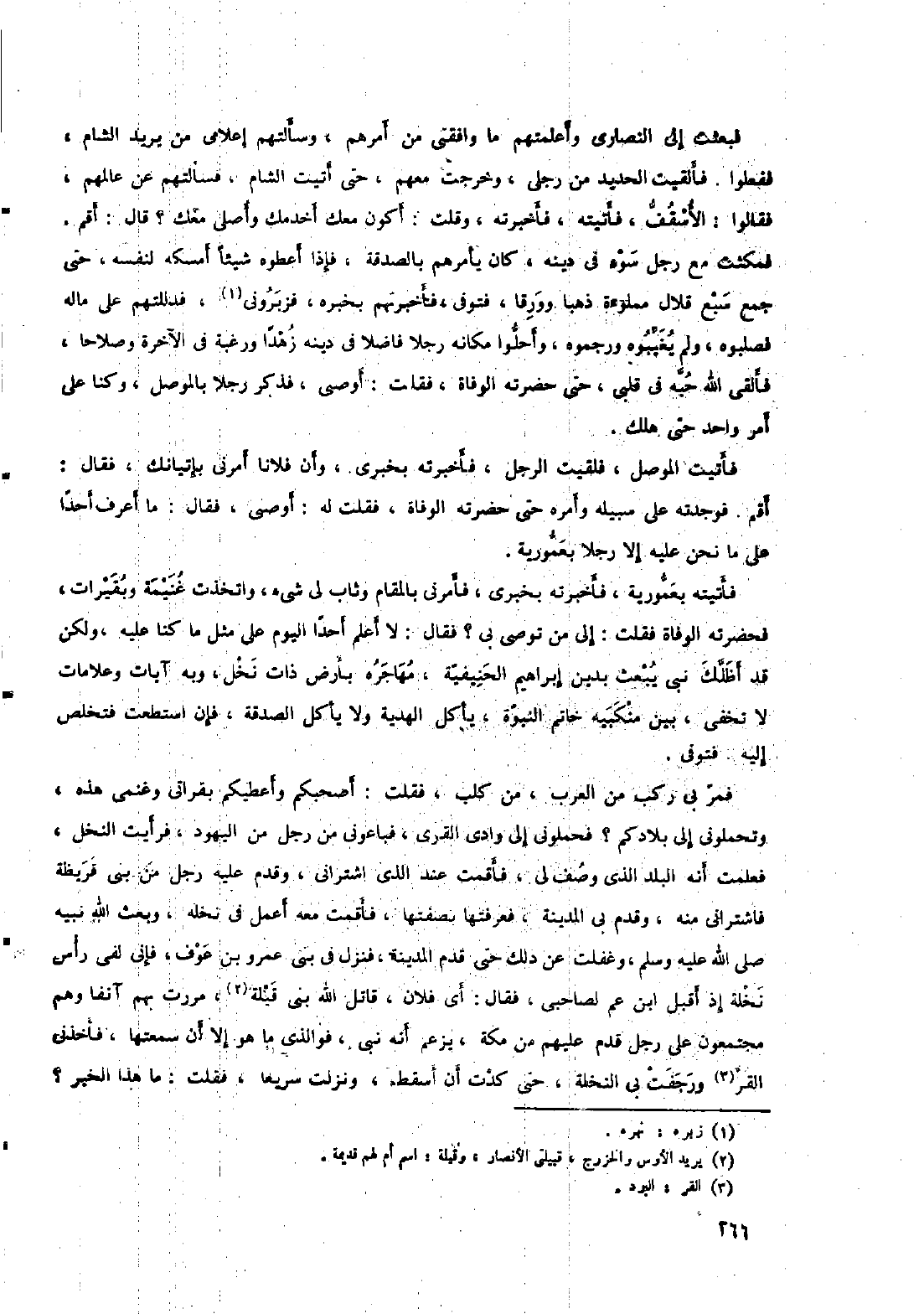 فمر بي ركب من العرب، من كلب، فقلت: أصحبكم وأعطيكم بقراتي وغنمي هذه، وتحملوني إِلَى بلادكم؟ فحملوني إِلَى وادي القرى، فباعوني من رجل من اليهود، فرأيت النخل، فعلمت أَنَّهُ البلد الذي وصف لي، فأقمت عند الذي اشتراني، وقدم عليه رجل من بنى قريظة فاشتراني منه، وقدم بي المدينة، فعرفتها بصفتها، فأقمت معه أعمل في نخله، وبعث اللَّه نبيه صَلَّى اللَّهُ عَلَيْهِ وَسَلَّمَ، وغفلت عَنْ ذلك حتى قدم المدينة، فنزل في بني عمرو بْن عوف، فأني لفي رأس نخلة إذ أقبل ابن عم لصاحبي، فقال: أي فلان، قاتل اللَّه بني قيلة [٢] ، مررت بهم آنفًا وهم مجتمعون عَلَى رجل قدم عليهم من مكة، يزعم أَنَّهُ نبي، فو الّذي ما هو إلا أن سمعتها، فأخذني القر [٣] ورجفت بي النخلة، حتى كدت أن أسقط، ونزلت سريعا، فقلت: ما هذا الخير؟