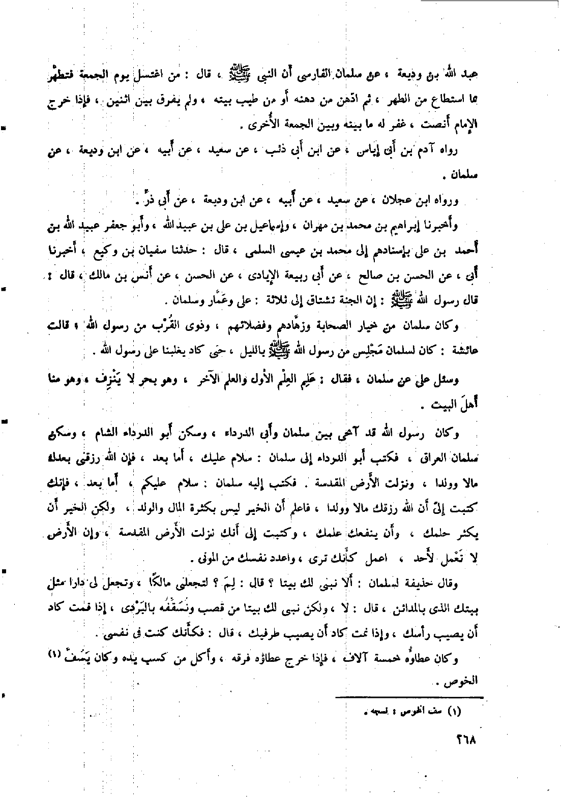 عَبْدِ اللَّهِ بْنِ وَدِيعَةَ، عَنْ سَلْمَانَ الْفَارِسِيِّ أن النبي صلى الله عليه وسلم، قال: مَنِ اغْتَسَلَ يَوْمَ الْجُمُعَةِ فَتَطَهَّرَ بِمَا اسْتَطَاعَ مِنَ الطُّهْرِ، ثُمَّ ادَّهَنَ مِنْ دُهْنِهِ أَوْ مِنْ طِيبِ بَيْتِهِ، وَلَمْ يُفَرِّقْ بَيْنَ اثْنَيْنِ، فَإِذَا خَرَجَ الإِمَامُ أَنْصَتَ، غُفِرَ لَهُ مَا بَيْنَهُ وَبَيْنَ الْجُمُعَةِ الأُخْرَى.