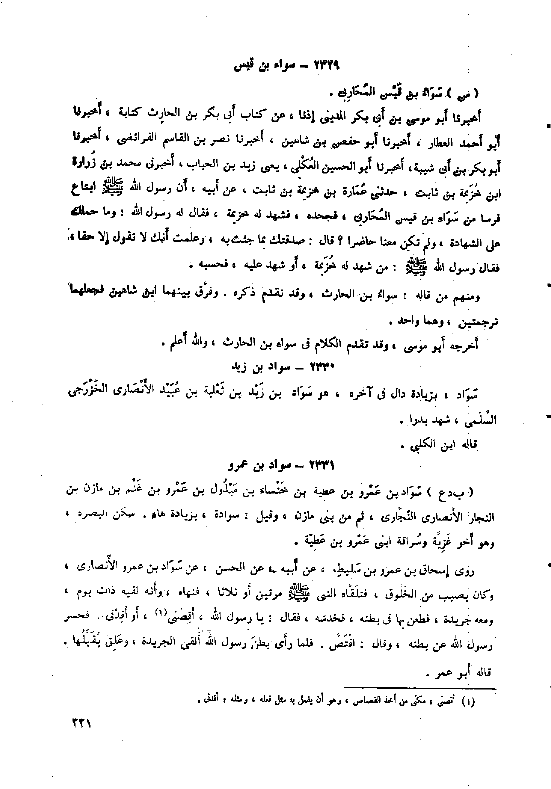 أَخْبَرَنَا أَبُو مُوسَى بْنُ أَبِي بَكْرٍ الْمَدِينِيُّ إِذْنًا، عَنْ كِتَابِ أَبِي بَكْرِ بْنِ الْحَارِثِ كِتَابَةً، أَخْبَرَنَا أَبُو أَحْمَدَ الْعَطَّارُ، أخبرنا أبو حفص بن شَاهِينَ، أَخْبَرَنَا نَصْرُ بْنُ الْقَاسِمِ الْفَرَائِضِيُّ، أَخْبَرَنَا أَبُو بَكْرِ بْنُ أَبِي شَيْبَةَ، أَخْبَرَنَا أَبُو الْحُسَيْنِ الْعُكْلِيُّ، يَعْنِي زَيْدَ بْنَ الْحُبَابِ، أَخْبَرَنِي محمد بن زرارة ابن خُزَيْمَةَ بْنِ ثَابِتٍ، حَدَّثَنِي عُمَارَةُ بْنُ خُزَيْمَةَ بْنِ ثَابِتٍ، عَنْ أَبِيهِ، أَنَّ رَسُول اللَّهِ صَلَّى اللَّهُ عَلَيْهِ وَسَلَّمَ ابْتَاعَ فَرَسًا مِنْ سَوَاءِ بْن قَيْسٍ الْمُحَارِبِيِّ، فَجَحَدَهُ، فَشَهِدَ لَهُ خزيمة، فقال له رسول الله: وَمَا حَمَلَكَ عَلَى الشَّهَادَةِ، وَلَمْ تَكُنْ مَعَنَا حَاضِرًا؟ قَالَ: صَدَّقْتُكَ بِمَا جِئْتَ بِهِ، وَعَلِمْتُ أَنَّكَ لا تَقُولُ إِلا حَقًّا، فَقَالَ رَسُول اللَّهِ صَلَّى اللَّهُ عَلَيْهِ وَسَلَّمَ: من شهد لَهُ خُزَيْمَةُ، أَوْ شَهِدَ عَلَيْهِ، فَحَسْبُهُ. ومنهم من قاله: سواء بْن الحارث، وقد تقدم ذكره. وفرق بينهما ابن شاهين فجعلهما ترجمتين، وهما واحد.