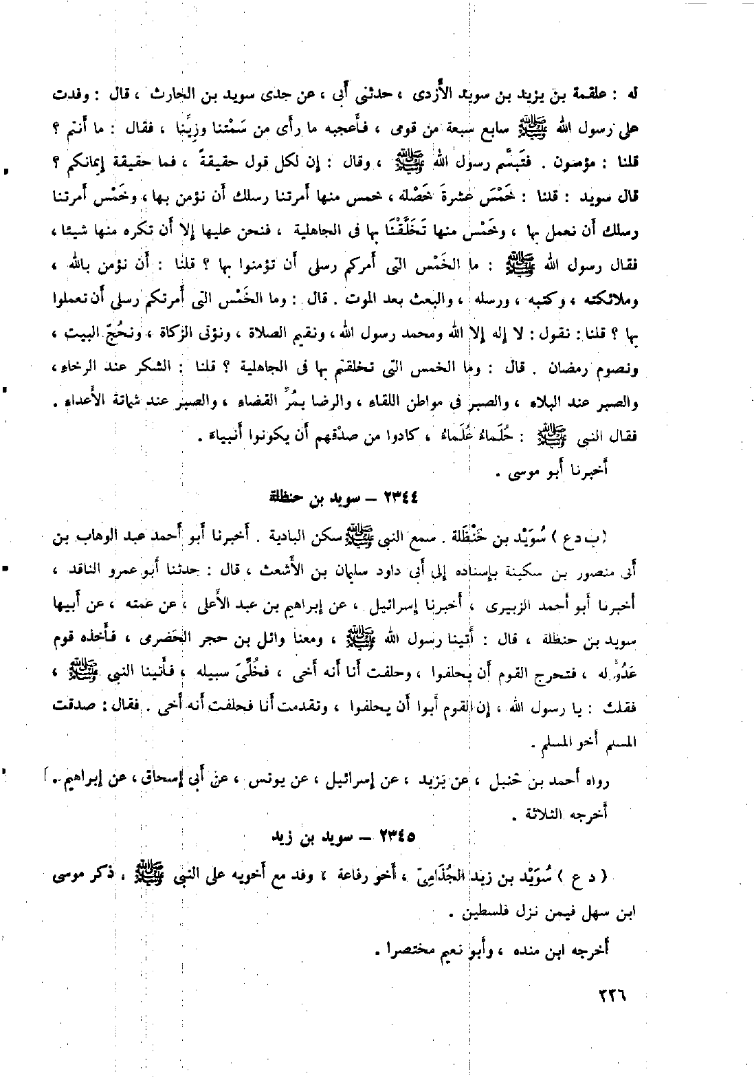 (ب د ع) سويد بْن حنظلة. سمع النَّبِيّ صَلَّى اللَّهُ عَلَيْهِ وَسَلَّمَ سكن البادية. أَخْبَرَنَا أَبُو أَحْمَدَ عَبْدُ الْوَهَّابِ بْنُ أَبِي مَنْصُورِ بْنِ سُكَيْنَةَ بِإِسْنَادِهِ إِلَى أَبِي دَاوُدَ سُلَيْمَانَ بْنِ الأَشْعَثِ، قَالَ: حَدَّثَنَا أَبُو عَمْرٍو النَّاقِدُ، أَخْبَرَنَا أَبُو أَحْمَدَ الزُّبَيْرِيُّ، أَخْبَرَنَا إِسْرَائِيلُ، عَنْ إِبْرَاهِيمَ بْنِ عَبْدِ الأَعْلَى، عَنْ عَمَّتِهِ، عَنْ أَبِيهَا سُوَيْدِ بْنِ حَنْظَلَةَ، قَالَ: أَتَيْنَا رَسُول اللَّهِ صَلَّى اللَّهُ عَلَيْهِ وَسَلَّمَ، وَمَعْنَا وَائِلُ بْنُ حُجْرٍ الْحَضْرَمِيُّ، فَأَخَذَهُ قَوْمٌ عَدُوٌّ لَهُ، فَتَحَرَّجَ الْقَوْمُ أَنْ يَحْلِفُوا، وَحَلَفْتُ أَنَا أَنَّهُ أَخِي، فَخُلِّيَ سَبِيلُهُ، فَأَتَيْنَا النَّبِيَّ صَلَّى اللَّهُ عَلَيْهِ وَسَلَّمَ، فَقُلْتُ: يَا رسول الله، إِنَّ الْقَوْمَ أَبَوْا أَنْ يَحْلِفُوا، وَتَقَدَّمْتُ أَنَا فَحَلَفْتُ أَنَّهُ أَخِي. فَقَالَ: صَدَقْتَ الْمُسْلِمُ أَخُو الْمُسْلِمِ.