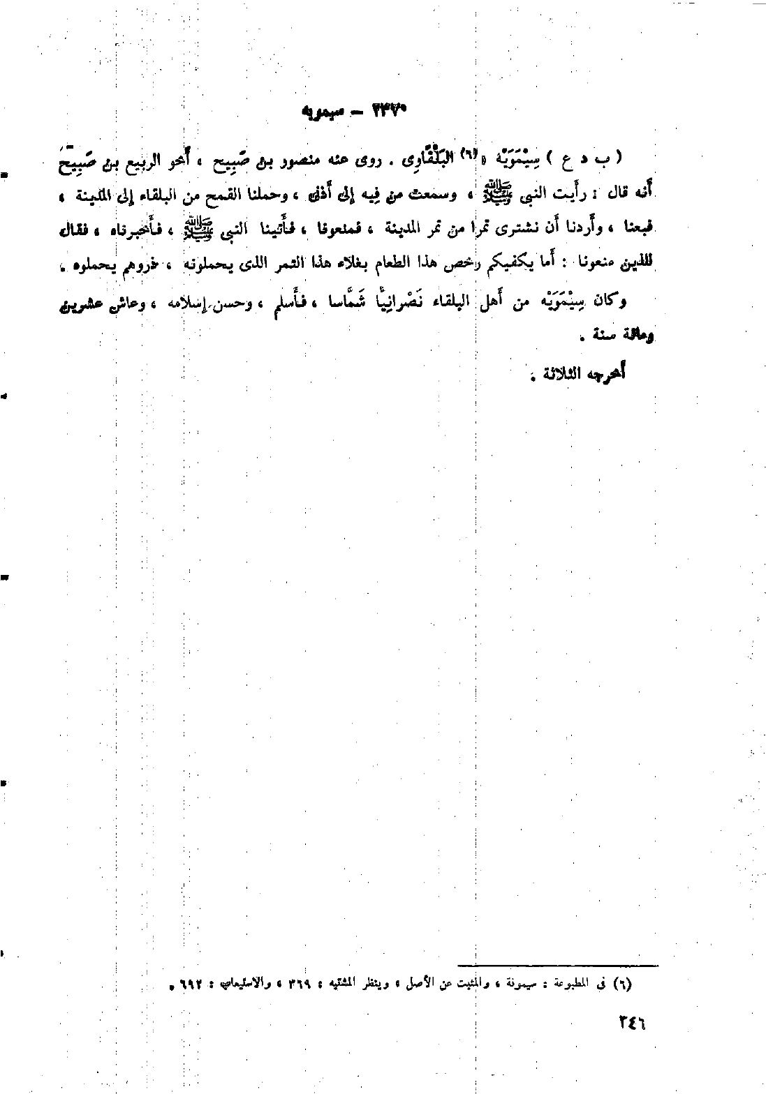 (ب د ع) سيمويه « [٦] البلقاوي. روى عنه مَنْصُور بْن صبيح، أخو الربيع بْن صبيح أَنَّهُ قال: رأيت النَّبِيّ صَلَّى اللَّهُ عَلَيْهِ وَسَلَّمَ، وسمعت من فيه إِلَى أذني، وحملنا القمح من البلقاء إِلَى المدينة، فبعنا، وأردنا أن نشترى تمرا من تمر المدينة، فمنعونا، فأتينا النَّبِيّ صَلَّى اللَّهُ عَلَيْهِ وَسَلَّمَ، فأخبرناه، فقال للذين منعونا: أما يكفيكم رخص هذا الطعام بغلاء هذا التمر الذي يحملونه، ذروهم يحملوه. وكان سيمويه من أهل البلقاء نصرانيًا شماسًا، فأسلم، وحسن إسلامه، وعاش عشرين ومائة سنة.