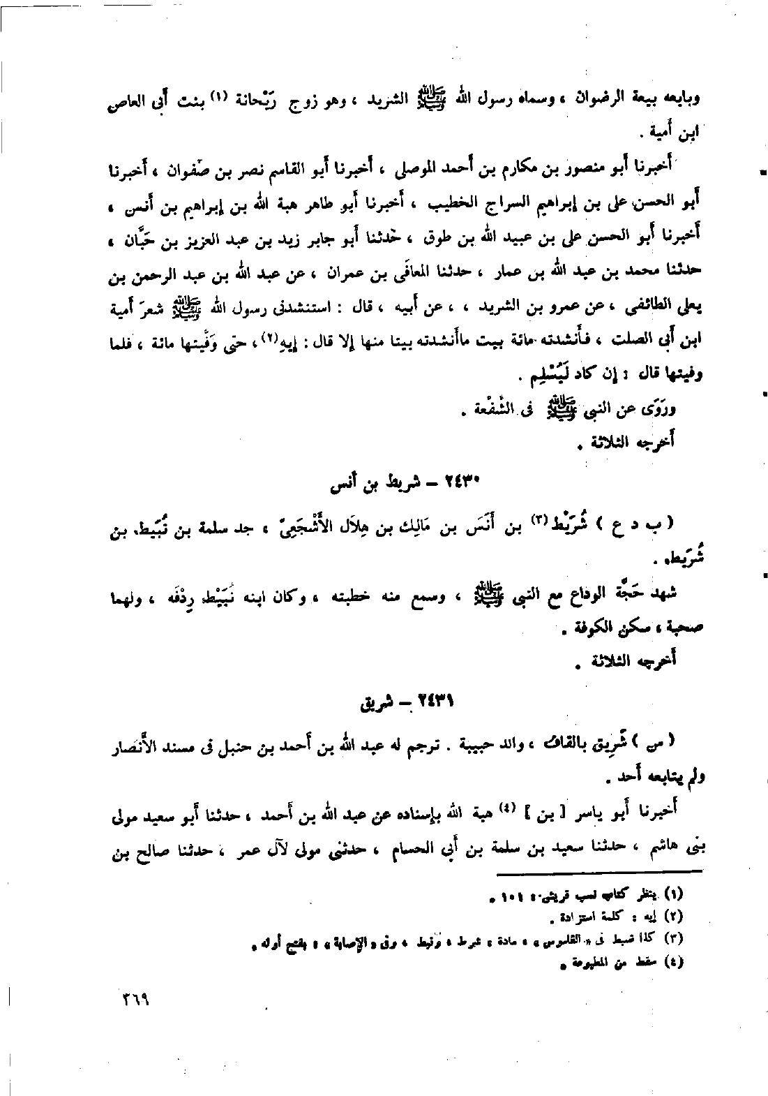 أَخْبَرَنَا أَبُو مَنْصُورِ بْنُ مَكَارِمَ بْنِ أَحْمَدَ الْمَوْصِلِيُّ، أَخْبَرَنَا أَبُو الْقَاسِمِ نَصْرُ بْنِ صَفْوَانَ، أَخْبَرَنَا أَبُو الْحَسَنِ عَلِيُّ بْنُ إِبْرَاهِيمَ السَّرَّاجُ الْخَطِيبُ، أَخْبَرَنَا أَبُو طَاهِرٍ هِبَةُ اللَّهِ بْنُ إِبْرَاهِيمَ بْنِ أَنَسٍ، أَخْبَرَنَا أَبُو الْحَسَنِ عَلِيُّ بْنُ عُبَيْدِ اللَّهِ بْنِ طَوْقٍ، حَدَّثَنَا أَبُو جَابِرٍ زَيْدُ بْنُ عَبْدِ الْعَزِيزِ بْنِ حبّان، حَدَّثَنَا مُحَمَّدُ بْنُ عَبْدِ اللَّهِ بْنِ عَمَّارٍ، حَدَّثَنَا الْمُعَافَى بْنُ عِمْرَانَ، عَنْ عَبْد اللَّهِ بْن عَبْدِ الرَّحْمَنِ بْن يَعْلَى الطَّائِفِيِّ، عَنْ عَمْرِو بْنِ الشَّرِيدِ، عَنْ أَبِيهِ، قَالَ: اسْتَنْشَدَنِي رَسُول اللَّهِ صَلَّى اللَّهُ عَلَيْهِ وَسَلَّمَ شِعْرَ أمية ابن أَبِي الصَّلْتِ، فَأَنْشَدْتُهُ مِائَةَ بَيْتٍ مَا أَنْشَدْتُهُ بَيْتًا مِنْهَا إِلا قَالَ: إِيهِ [٢] ، حَتَّى وَفَّيْتُهَا مِائَةً، فَلَمَّا وَفَّيْتُهَا قَالَ: إِنْ كَادَ لَيُسْلِمُ. وروي عن النبي صلى الله عليه وسلم في الشّفعة.