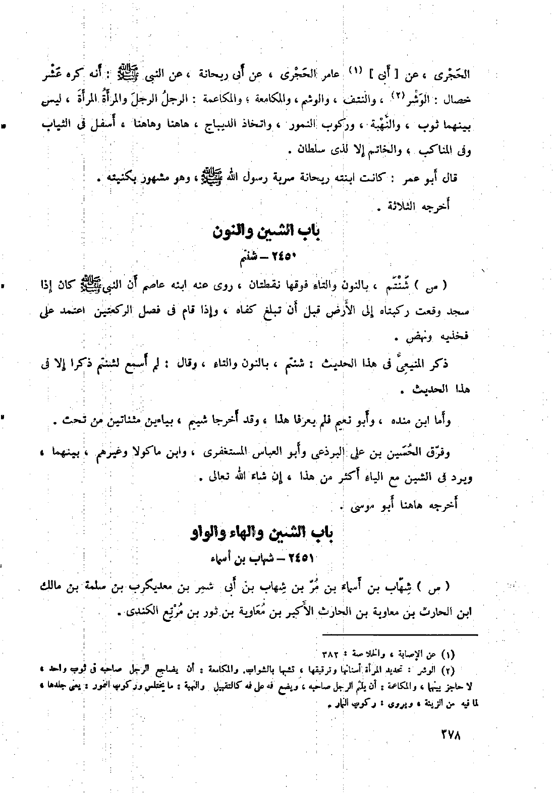 الْحَجْرِيِّ، عَنْ [أَبِي] [١] عَامِرٍ الْحَجْرِيِّ، عَنْ أَبِي رَيْحَانَةَ، عَنِ النَّبِيِّ صَلَّى اللَّهُ عَلَيْهِ وَسَلَّمَ: أَنَّهُ كَرِهَ عَشْرَ خِصَالٍ: الْوَشْرَ [٢] ، وَالنَّتْفَ، وَالْوَشْمَ، وَالْمُكَامَعَةَ، وَالْمُكَاعَمَةَ: الرَّجُلُ الرَّجُلَ وَالْمَرْأَةُ الْمَرْأَةَ، لَيْسَ بَيْنَهُمَا ثَوْبٌ، وَالنُّهْبَةَ، وَرُكُوبَ النُّمُورِ، وَاتِّخَاذَ الدِّيبَاجِ، هَا هُنَا وَهَا هُنَا، أَسْفَلَ فِي الثِّيَابِ وفي المناكب، والخاتم إلا الّذي سُلْطَانٍ.