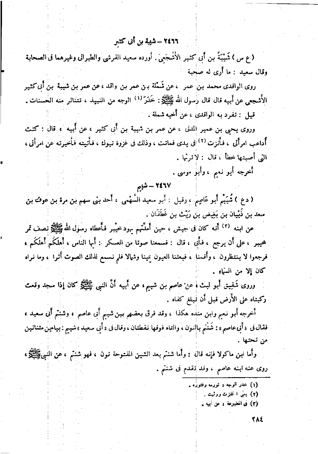(ع س) شيبة بْن أَبِي كثير الأشجعي. أورده سَعِيد القرشي والطبراني وغيرهما في الصحابة وقال سَعِيد: ما أرى له صحبة روى الواقدي مُحَمَّد بْن عمر، عَنْ شملة بْن عمر بْن واقد، عَنْ عمر بْن شيبة بْن أَبِي كثير الأشجعي عَنْ أبيه قال قال رسول الله صلى الله عليه وسلم: خدر [١] الوجه من النبيذ، تتناثر منه الحسنات. قيل: تفرد به الواقدي، عَنْ أخيه شملة.