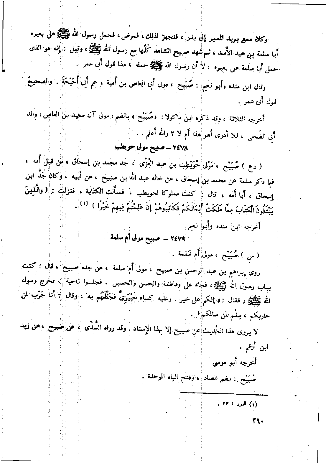 (د ع) صبيح، مولى حويطب بْن عبد العزى، جد مُحَمَّد بْن إِسْحَاق، من قبل أمه، فيما ذكر سلمة عَنْ مُحَمَّدِ بْنِ إِسْحَاق، عَنْ خاله عَبْد اللَّهِ بْن صبيح، عَنْ أبيه، وكان جد ابن إِسْحَاق، أبا أمه، قال: كنت مملوكًا لحويطب، فسألت الكتابة، فنزلت: وَالَّذِينَ يَبْتَغُونَ الْكِتابَ مِمَّا مَلَكَتْ أَيْمانُكُمْ فَكاتِبُوهُمْ إِنْ عَلِمْتُمْ فِيهِمْ خَيْراً ٢٤: ٣٣ [١] .