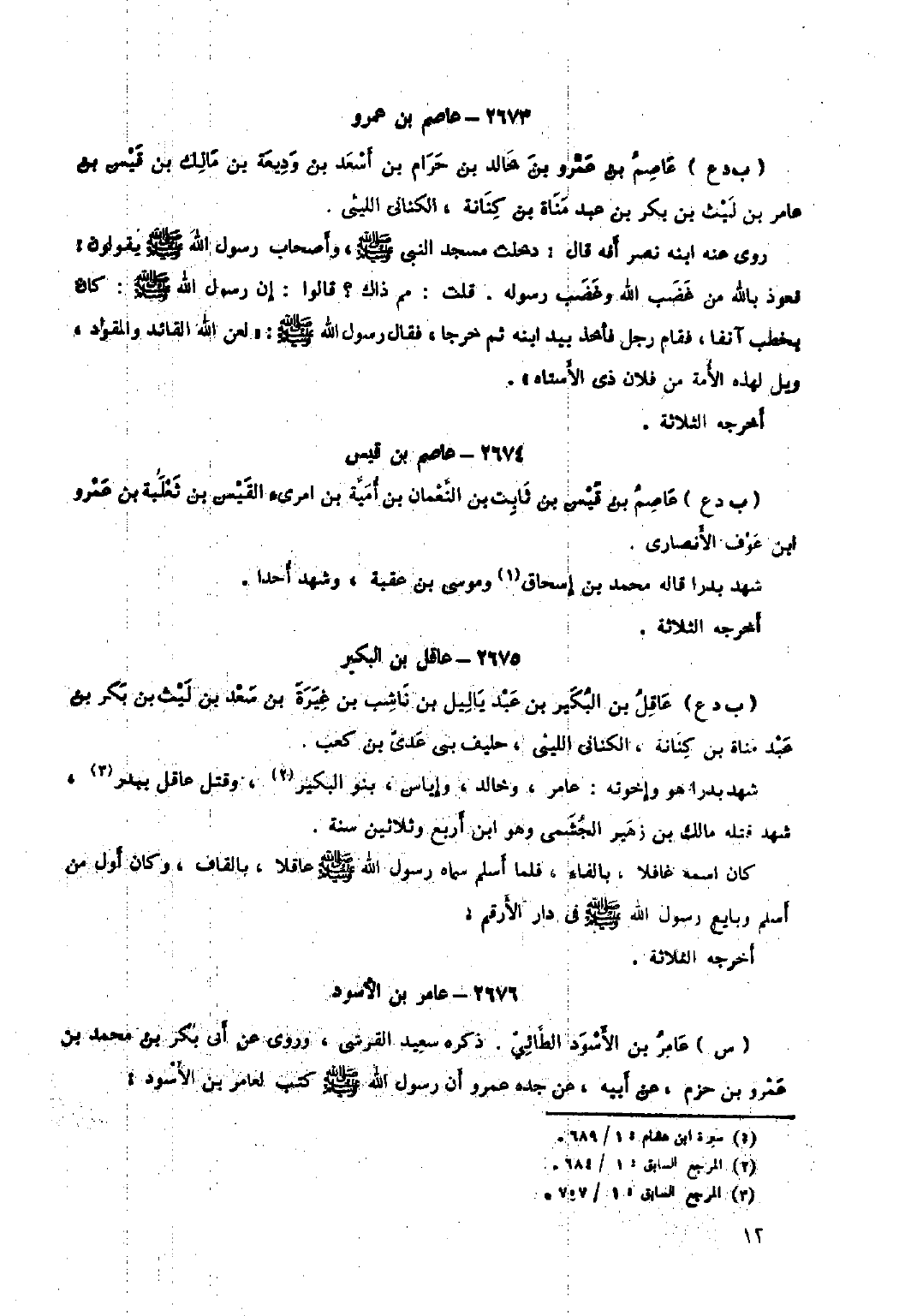 (ب د ع) عاصم بْن عمرو بْن خَالِد بْن حرام بن أسعد بْن وديعة بْن مالك بْن قيس بْن عامر بْن ليث بْن بكر بْن عبد مناة بن كنانة، الكناني الليثي.